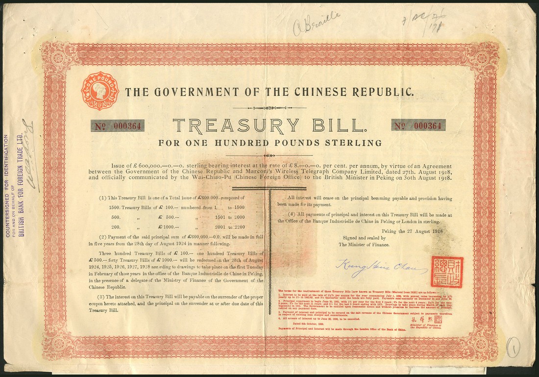 1918, 8% 'Marconi' Treasury Bill, £100 bond, no.364 of only 1500 issued, ornate border, red and black, yellow underprint, on poor quality paper, coupons removed and re-attached, very minor split at fold, good very fine and much better than usual condition.