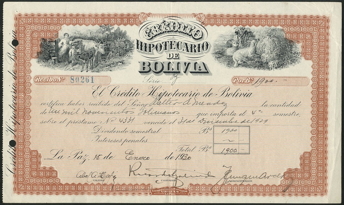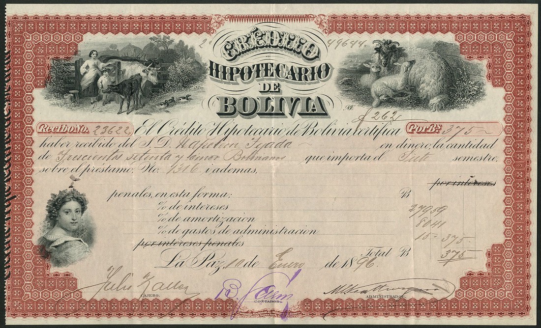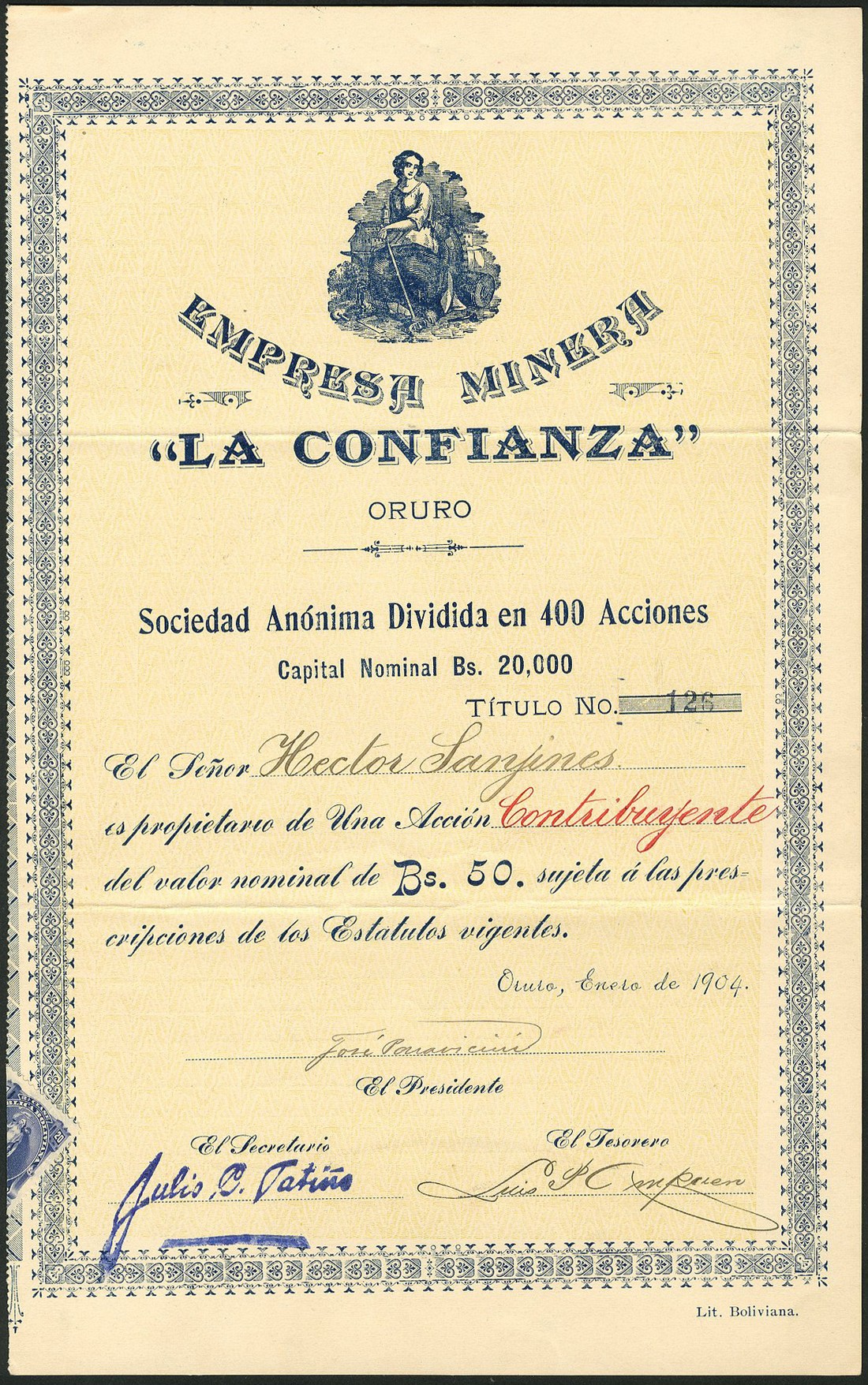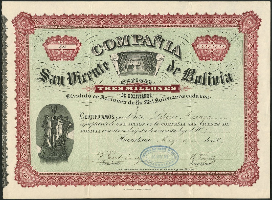 Compañia San Vincente de Bolivia, certificate for one share of 1000 bolivianos, 1887, no.24, ornate border, vignettes of workers in mine shaft, maroon and black with green underprint, together with four more Bolivian certificates comprising; Empresa Minera "La Confianza", 50 boliviano shares, 1904, no.126, blue and yellow; Credito Hipotecario de Bolivia, three pieces, 1[909], 18[96] and 19[30], all with ornate borders and vignettes of livestock and female figures, the first green, latter two brown, all extremely fine. (5)