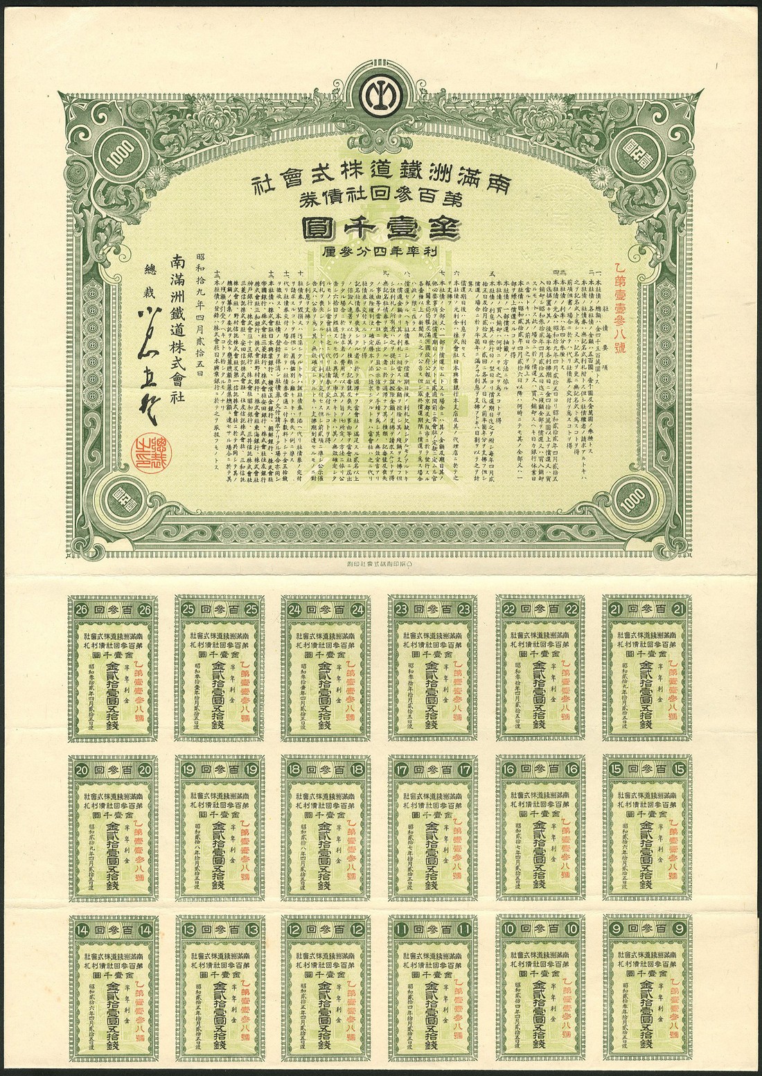 South Manchuria Railway Co. Ltd., 4.3% Loan, bond for 1000 yen, ornate border, green and black, with coupons, extremely fine.