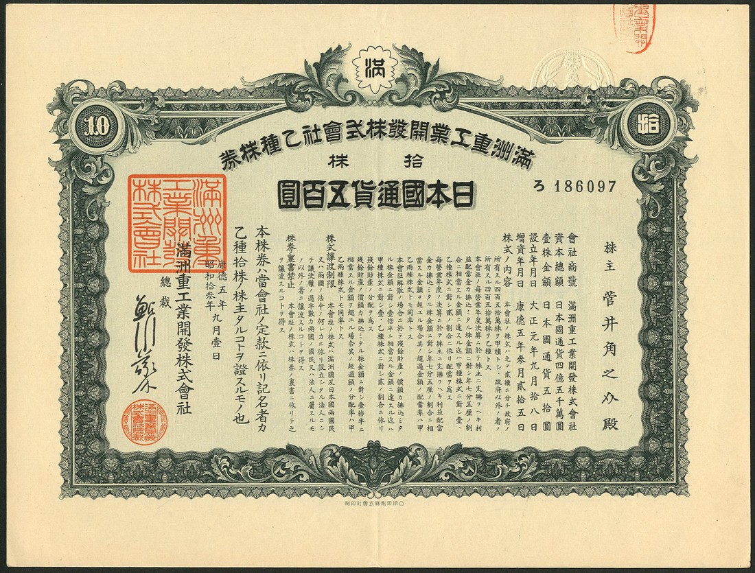 Manchurian Heavy Industries Development Co. Ltd., a pair of certificates for 10 shares, 500 yen, circa 1930's, ornate border, one purple and one dark green, embossed seal at top, extremely fine and good very fine respectively. (2)