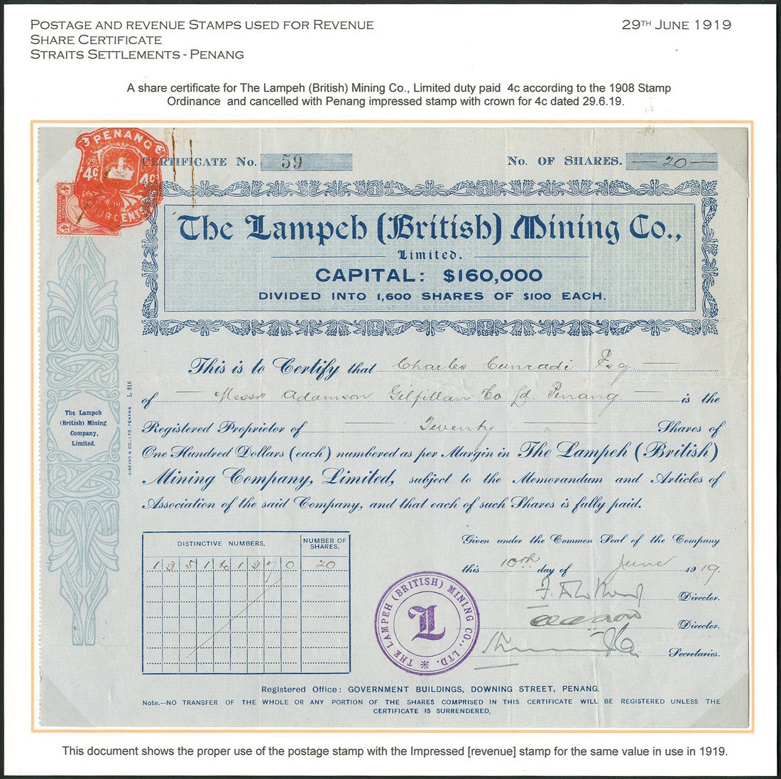 Lampeh (British) Mining Co. Ltd., $100 shares, 19[19], no.59, scrollwork at left, blue, adhesive Straits Settlements and impressed Penang revenue stamps, rust mark at top edge, very fine and scarce.