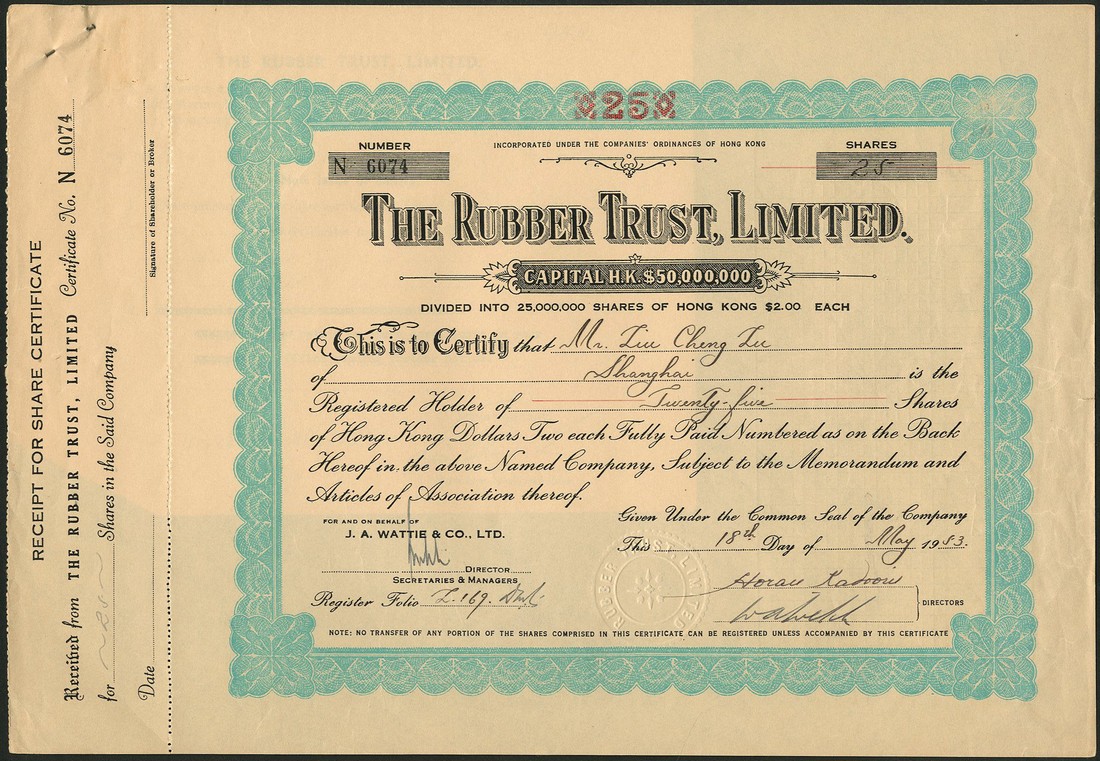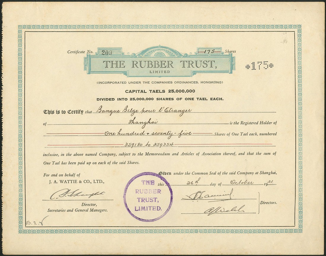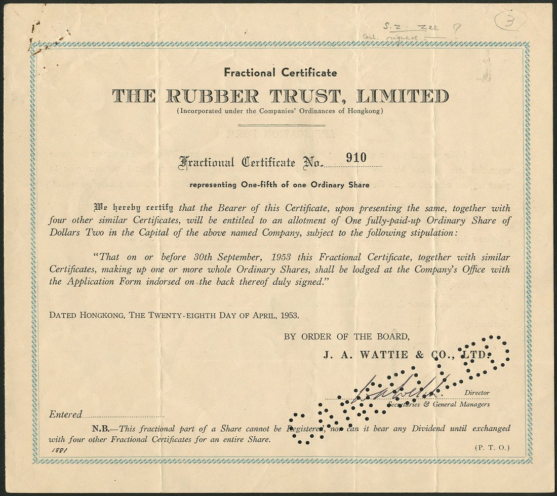 The Rubber Trust Ltd., one tael shares, Shanghai 19[31], 4 examples, together with HK$2 shares, 19[53], capital $50 million (2) and another dated 19[54], with capital overprinted to $60,000,000, and fractional certificates, 1953 (8), all blue and black, the last cancelled, fine to extremely fine. (15)