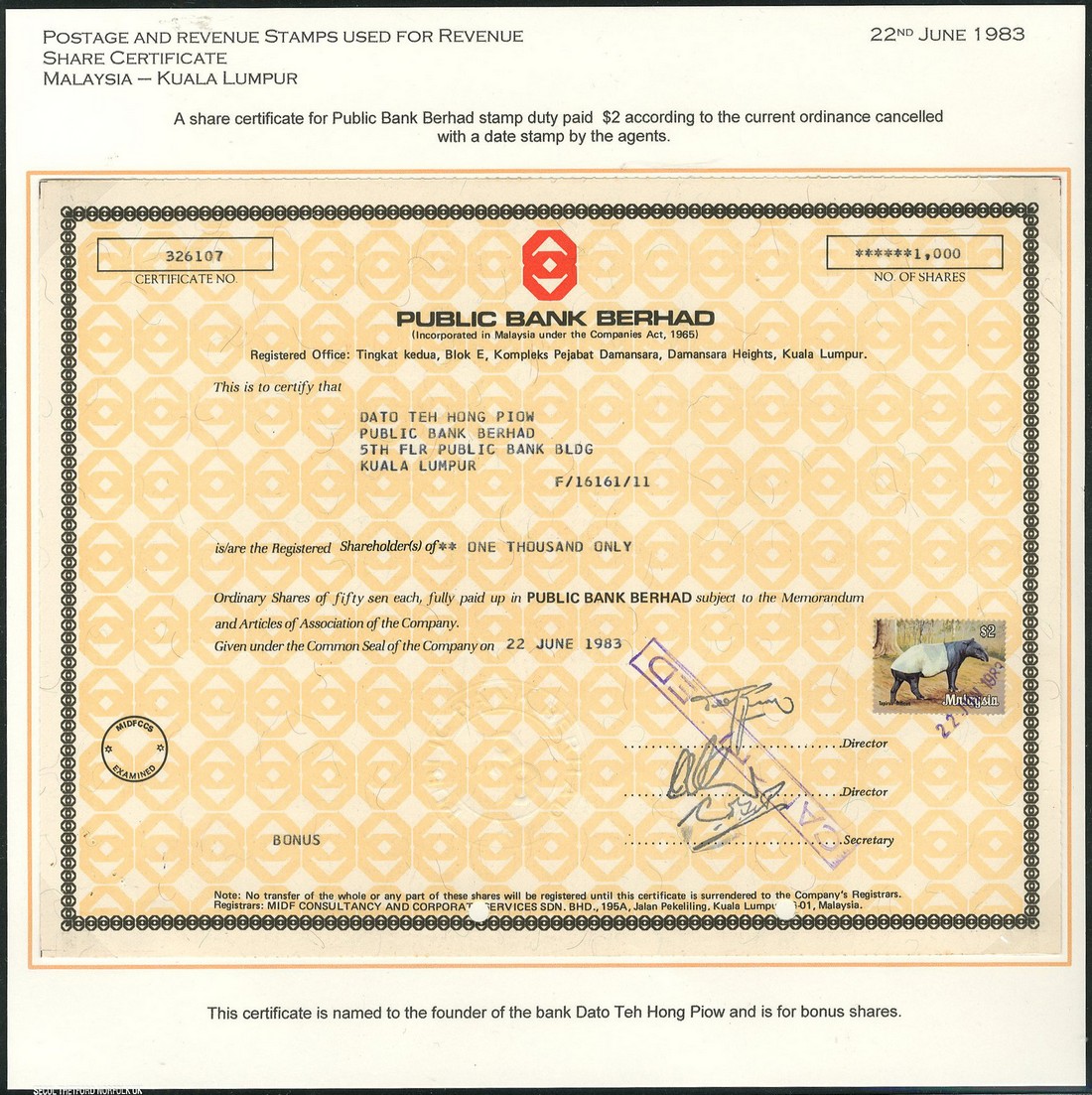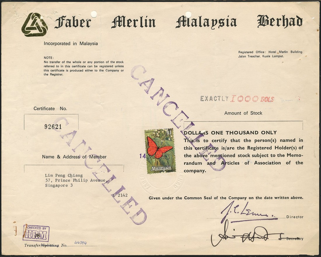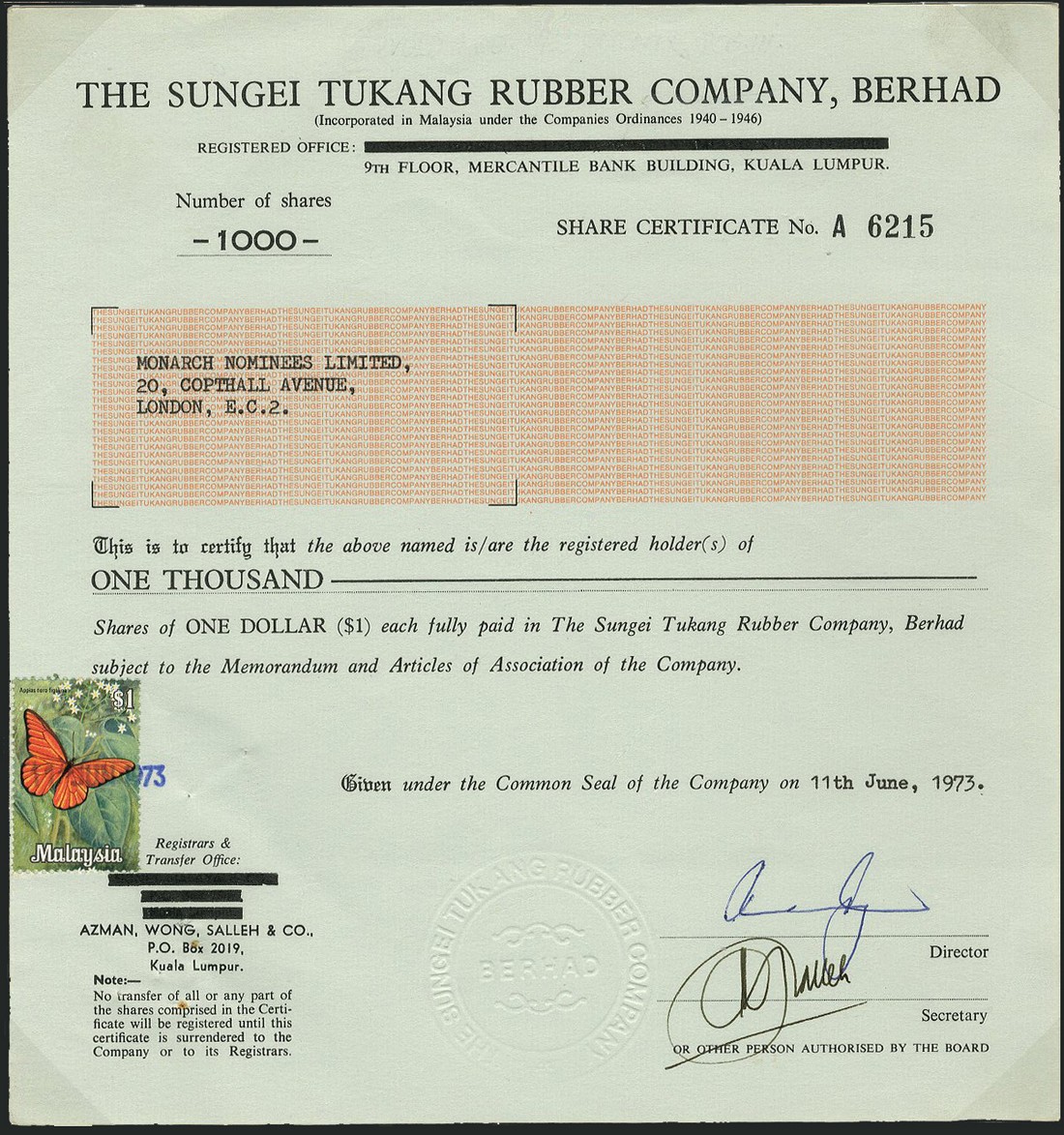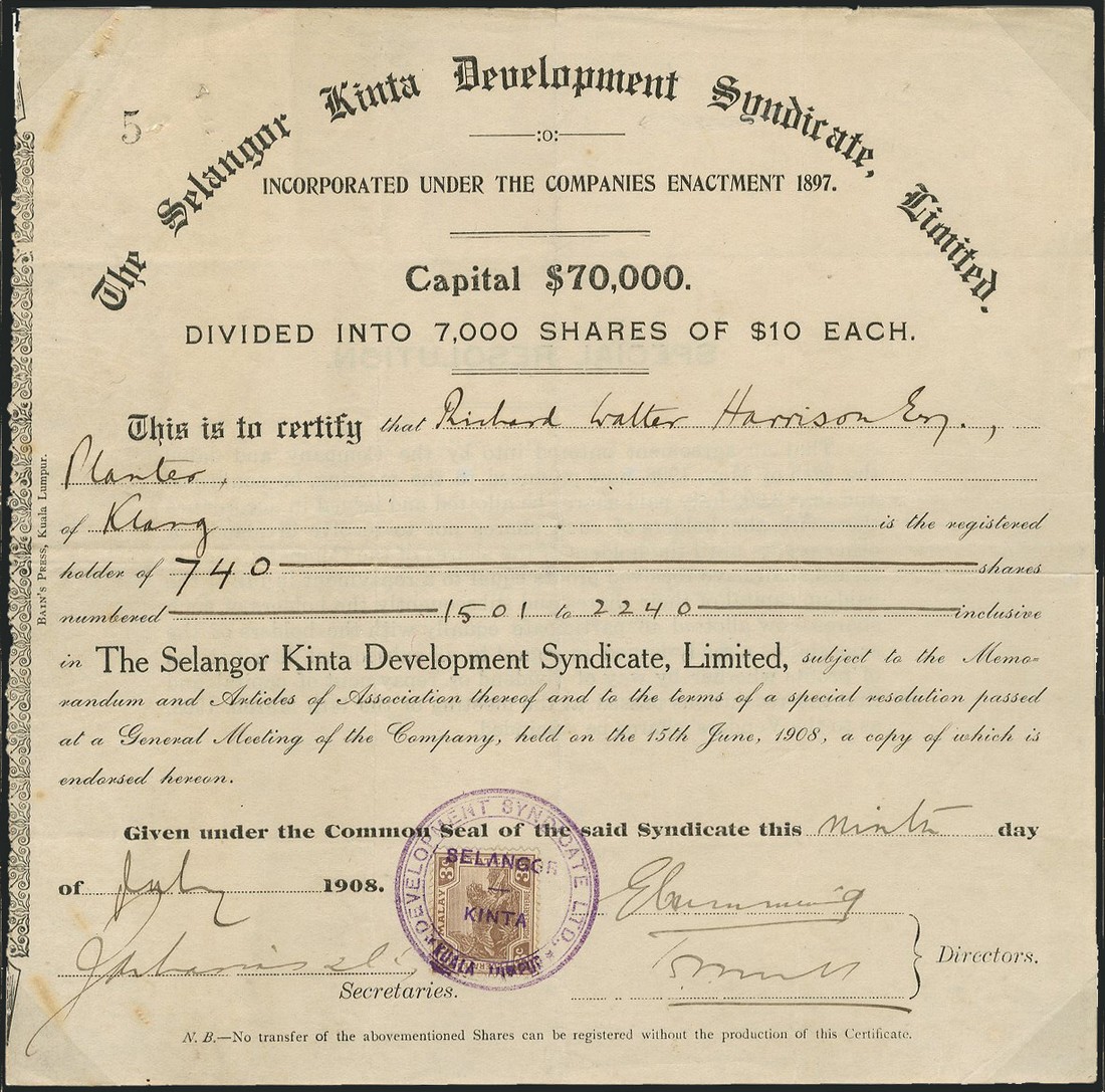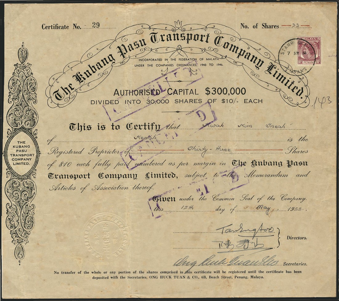 Selangor Kinta Development Syndicate Ltd., $10 shares, 1908, no.5, company seal over adhesive Federated Malay States revenue stamp, together with Kubang Pasu transport Co. Ltd., $10 shares, 19[55], no. 29, black, CANCELLED, and more modern companies (3), all with adhesive revenue stamps, the first about very fine, the second fine, the remainder extremely fine. (5)