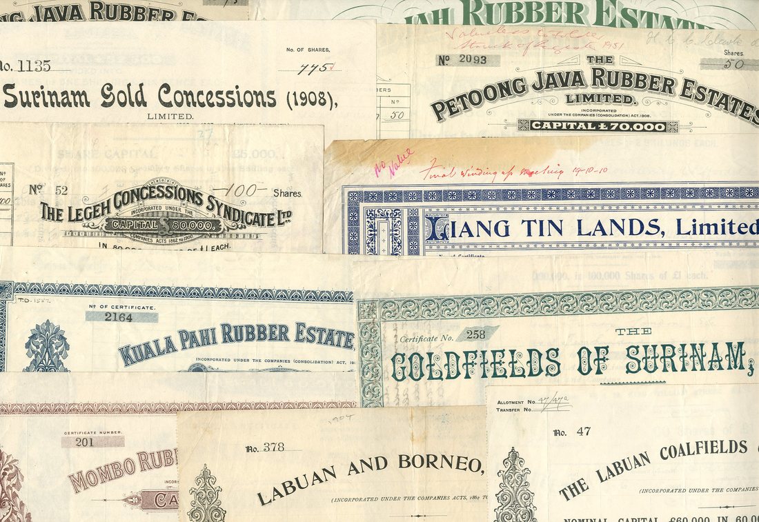 Mining companies in Malaysia and Indonesia, including British Borneo Gold Mining Co. Ltd., £1 shares, 188[6], no.89, scrollwork at left, black (this piece with tears and pieces missing from top and bottom, only fair); Labuan Coalfields Co. Ltd., £1 shares, 190[3], scrollwork at left, black; Labuan and Borneo Ltd., £1 shares, 189[8] and 189[9], black; Goldfields of Surinam Ltd., £1 shares, 189[7], ornate border, green; Klian Kellas Tin & Rubber Co. Ltd., 2 shilling shares, 191[0], black on pink paper; Kuala Pahi Rubber Estate Ltd., 2 shilling shares, 191[0], ornate border, blue; Mombo Rubber Plantation Ltd., £1 shares, 191[1], maroon; Pahang-Kabang Ltd., £1 ordinary shares, 1900, maroon; Legeh Concessions Syndicate Ltd., £1 shares, 190[6], black; Liang Tin Lands Ltd., £1 shares, 1[899], blue; Surinam Gold Concessions (1908) Ltd., 1 shilling shares, 19[09], black, and others, mixed condition, fine to very fine at best. (39)