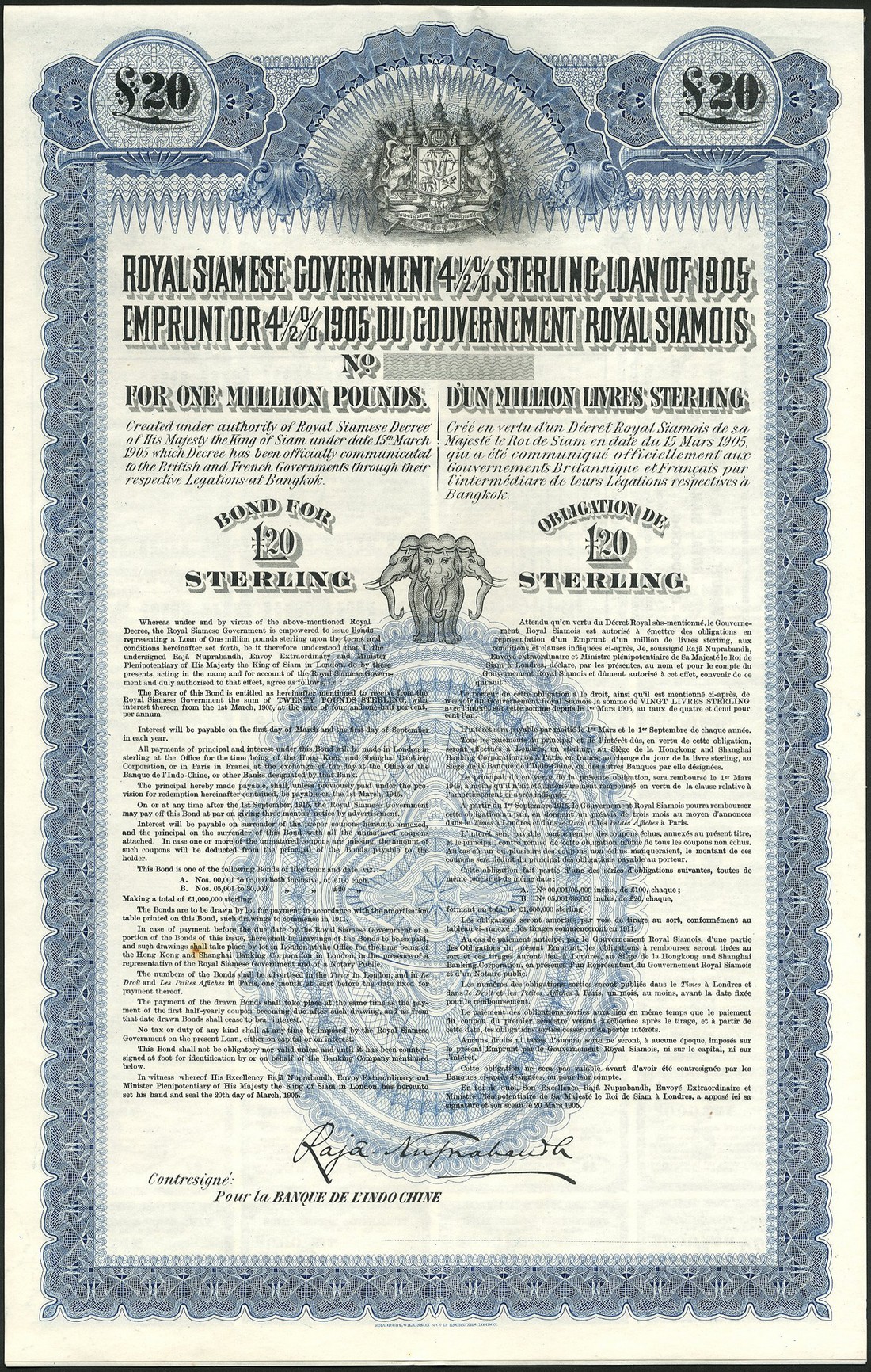 Royal Siamese Government 4½% Sterling Loan of 1905, unissued bond for £20, countersigned by the Banque de L'Indo Chine, Siamese arms at top, elephants in centre, blue and black, printed by Bradbury, Wilkinson & Co., with full coupon sheets, not numbered, extremely fine and rare.