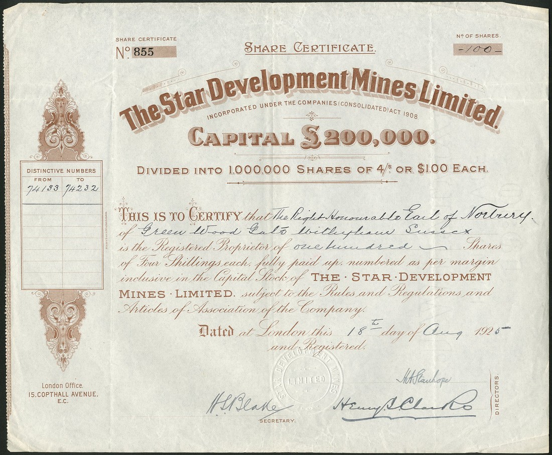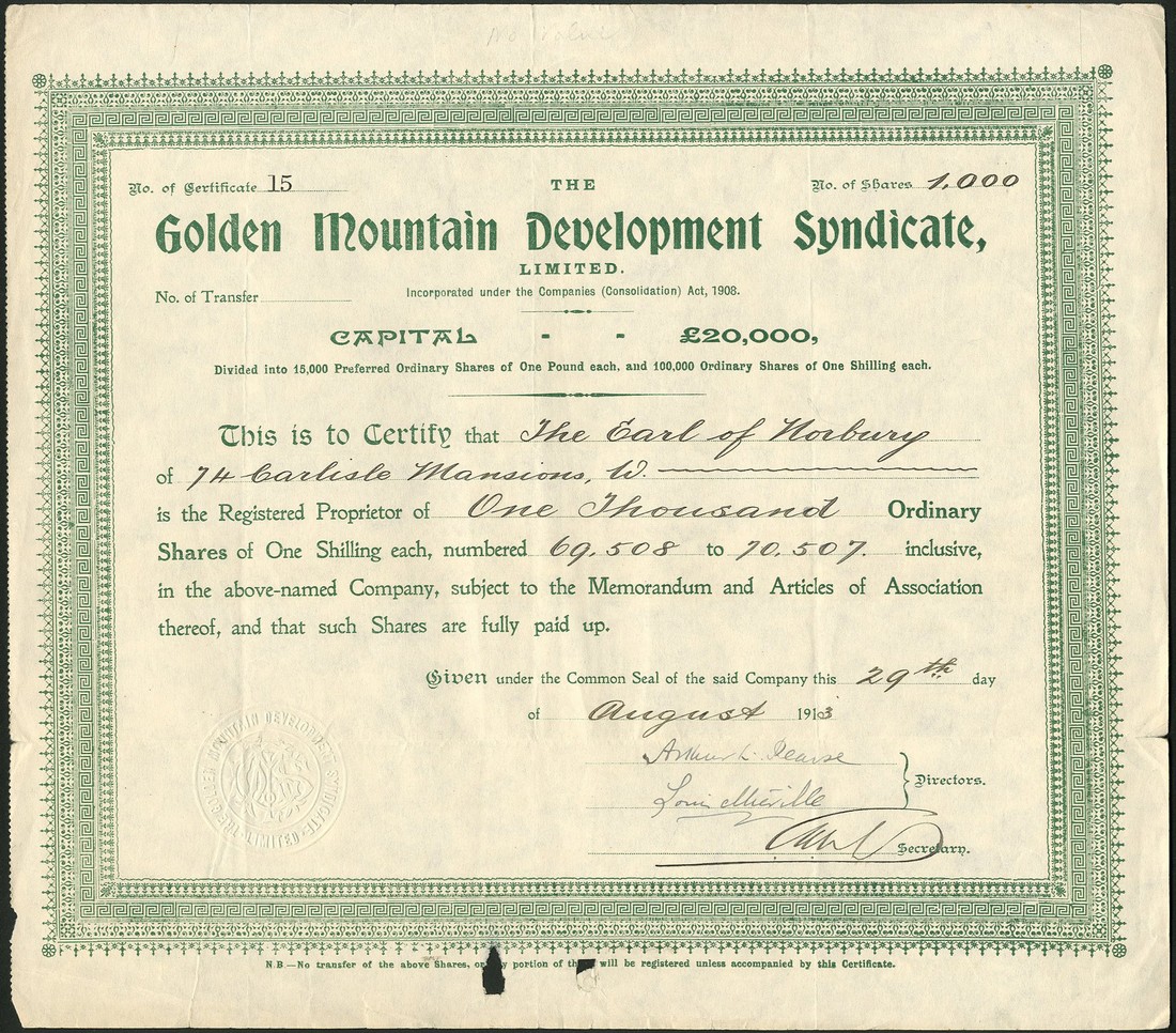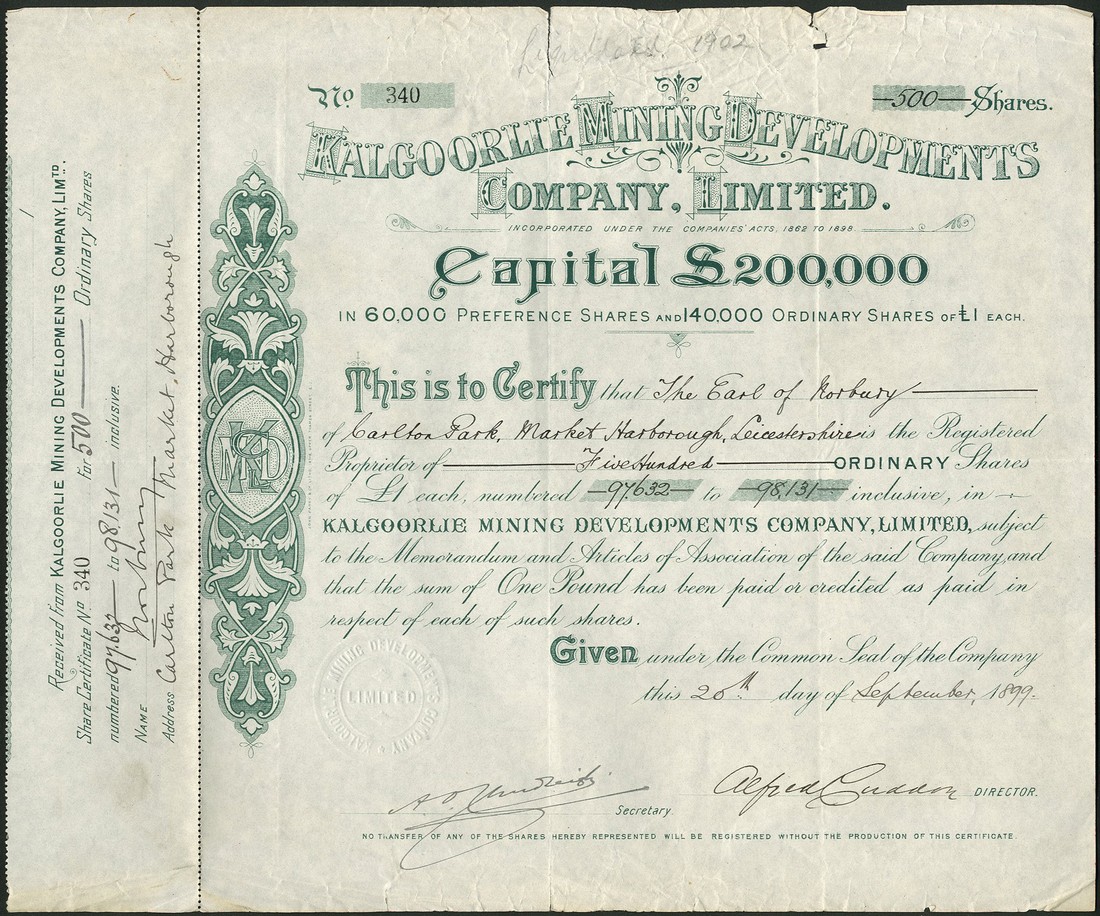 A small group of Australian Mining certificates, issued to the Earl of Norbury, comprising Kalgoorlie Mining Developments Co. Ltd., £1 shares, 1[899], no.340, decorative title and scrollwork at left, green; Queensland Quicksilver Estates Ltd., £1 shares, 18[87], no.212, scrollwork at left, black; Claremont Gold Mine Ltd., 5 shilling shares, 19[09], no.871, black; Golden Mountain Development Syndicate Ltd., 1 shilling shares, 191[3], no.15, ornate border, green, and Star Development Mines Ltd., 4 shilling ($1) shares, 2 examples, 192[0] and 192[5], brown, the first with tears at top and bottom, fourth has 2 holes at bottom, otherwise only light folds, very fine. (6)