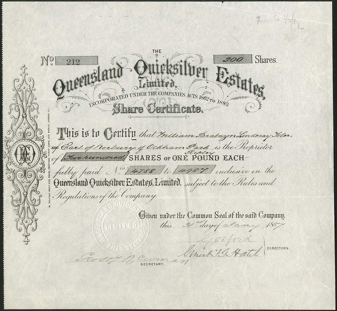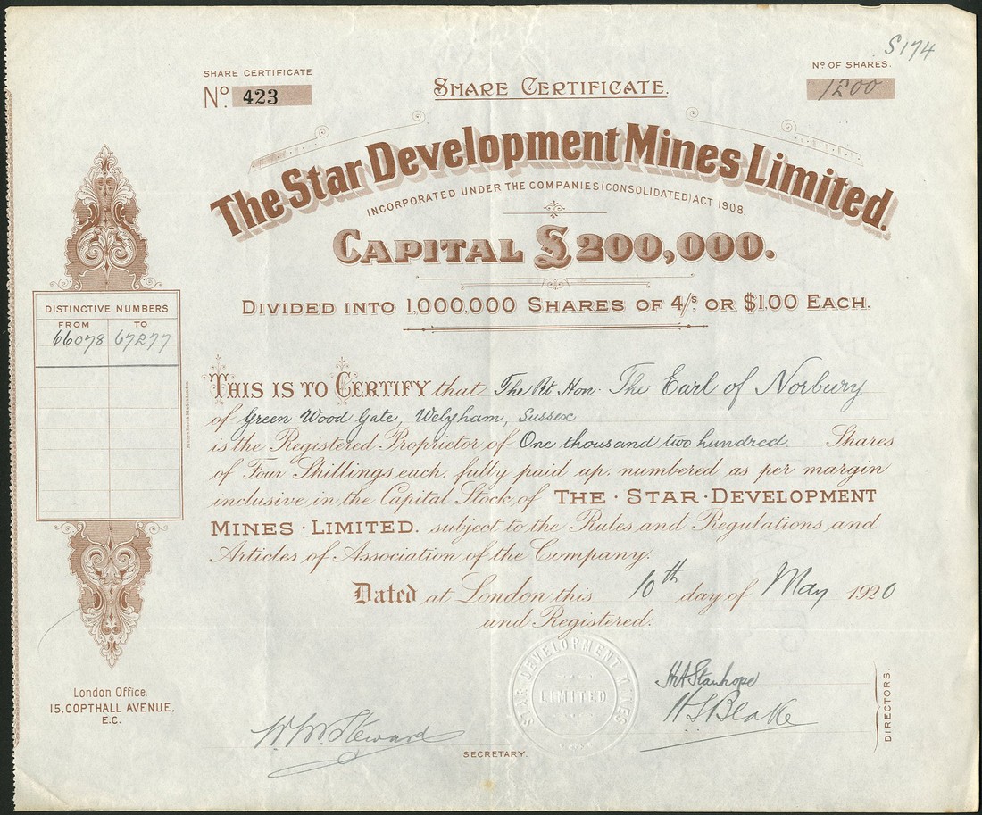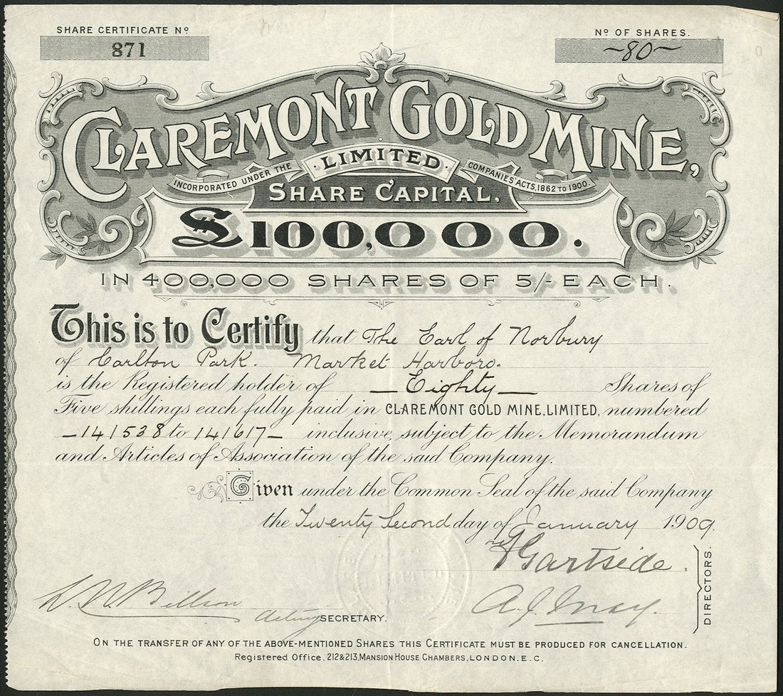 A small group of Australian Mining certificates, issued to the Earl of Norbury, comprising Kalgoorlie Mining Developments Co. Ltd., £1 shares, 1[899], no.340, decorative title and scrollwork at left, green; Queensland Quicksilver Estates Ltd., £1 shares, 18[87], no.212, scrollwork at left, black; Claremont Gold Mine Ltd., 5 shilling shares, 19[09], no.871, black; Golden Mountain Development Syndicate Ltd., 1 shilling shares, 191[3], no.15, ornate border, green, and Star Development Mines Ltd., 4 shilling ($1) shares, 2 examples, 192[0] and 192[5], brown, the first with tears at top and bottom, fourth has 2 holes at bottom, otherwise only light folds, very fine. (6)