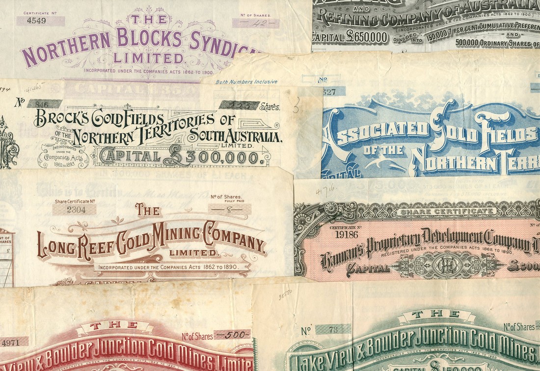 A useful group of Australian certificates (8), comprising Lake View and Boulder Junction Gold Mines Ltd., fully paid shares, 1900 and part paid shares, 1902; Long Reef Gold Mining Co. Ltd., 1904; Hannan's Proprietary Development Co. Ltd., 1901; Brock's Goldfields of the Northern Territories of South Australia Ltd., 1900; Associated Gold Fields of the Northern Territory Ltd., 1904, this with corner torn away; Northern Blocks Syndicate Ltd., 1904, and Smelting and Refining Company of Australia (1901) Ltd., 1904, together with New Zealand trust & Loan Co. Ltd., 1901, generall fine to very fine, a few better. (9)