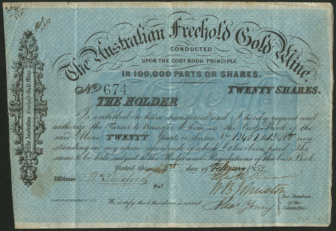 Australian Freehold Gold Mine, 20 shares, 1852, no.674, black with heavy blue underprint, scrollwork at left, about very fine.