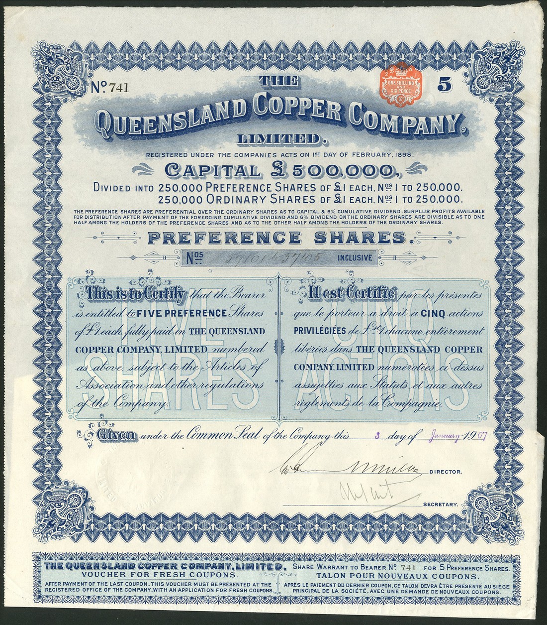 Queensland Copper Co. Ltd., a group of 10 bearer certificates for 5 preference shares of £1, 19[07], ornate border with scrollwork at corners, blue, text in English and French, all with coupons, good very fine. (10)