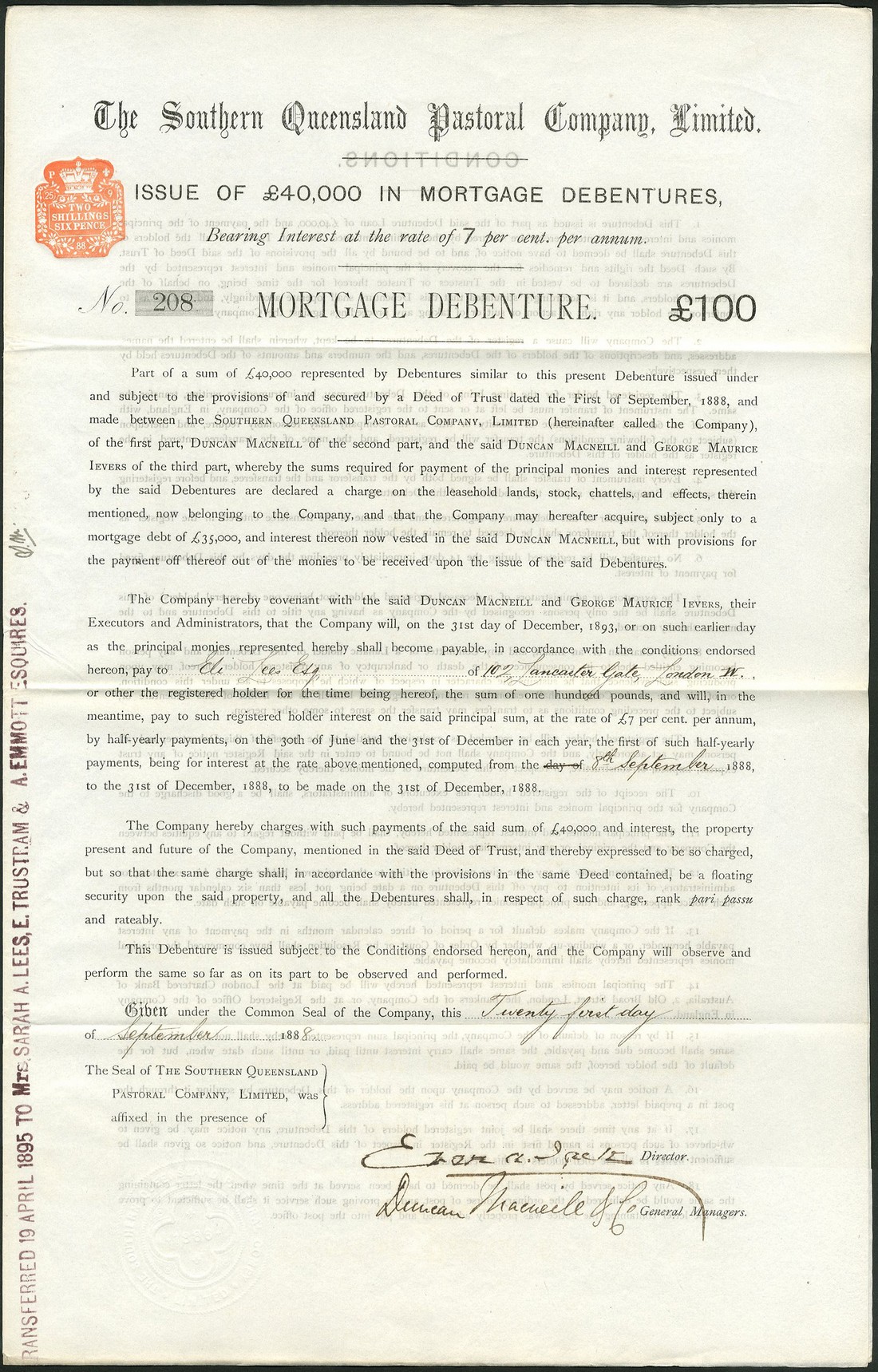 Southern Queensland Pastoral Co. Ltd., a group of 27 7% mortgage debentures for £100, of only 400 issued, large format, four pages, black, all good very fine. (27)