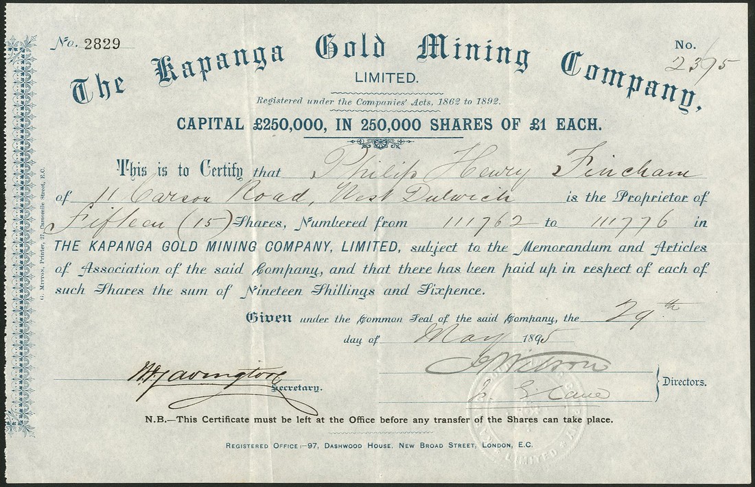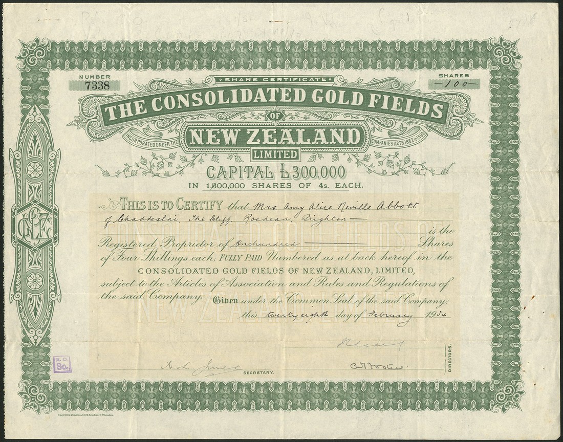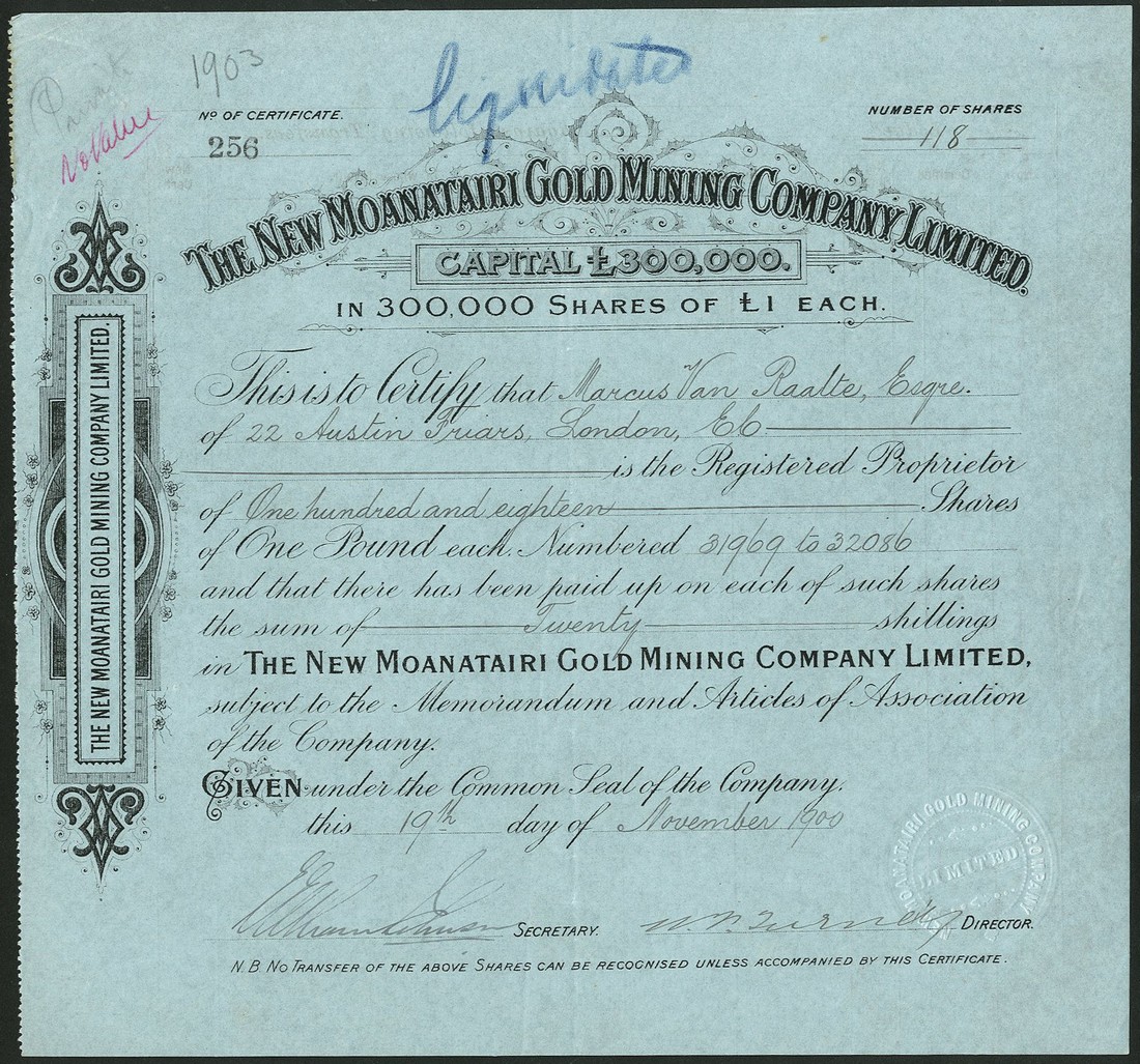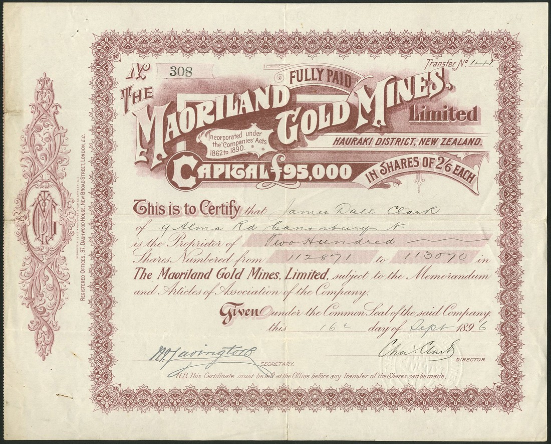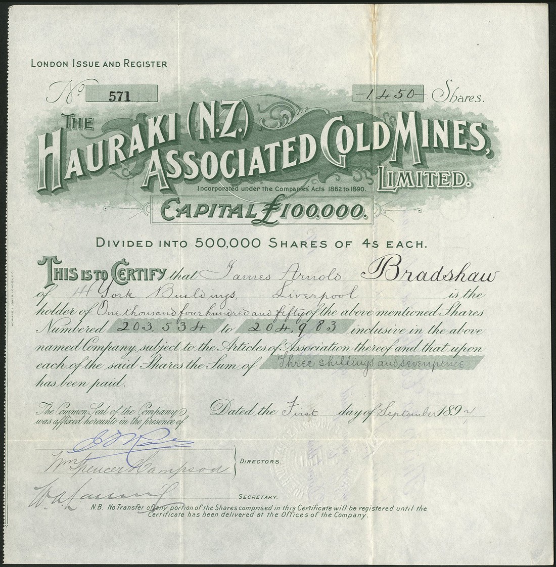 A group of New Zealand gold mining companies comprising Kapanga Gold Mining Co. Ltd., £1 shares, 189[5], blue-green; Hauraki (N.Z.) Associated Gold Mines Ltd., 4 shilling shares, 189[7], decorative title, green; Maoriland Gold Mines Ltd., 2/6d shares, 189[6], ornate border, maroon; New Moanatairi Gold Mining Co. Ltd., £1 shares, 1900, black on blue paper; and Consolidated Gold Fields of New Zealand, 4 shilling shares, 19[34], ornate border, green, generally very fine and better. (5)