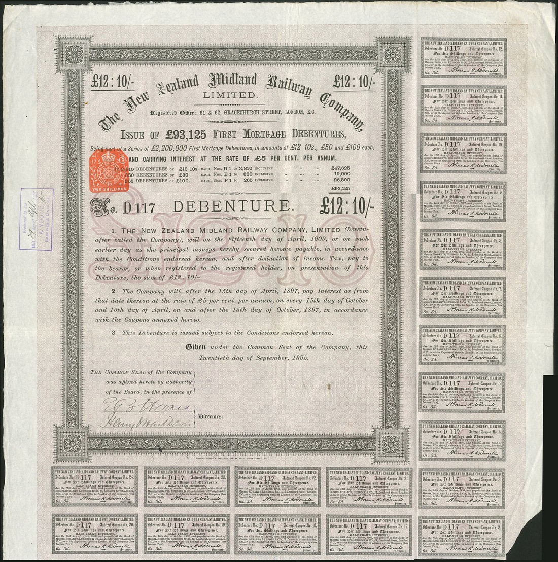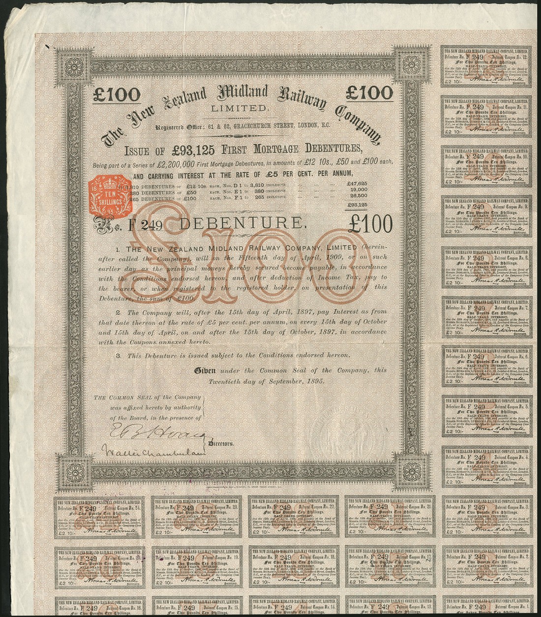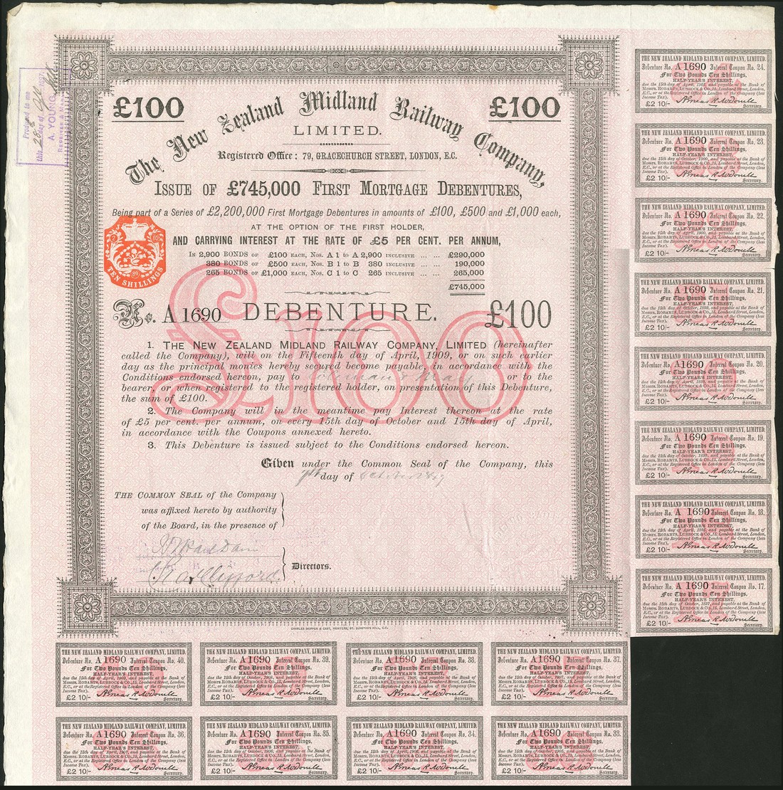 New Zealand Midland Railway Co. Ltd., a group of First Mortgage debentures, £100, 1889, no.A1690, one of only 265 issued, and £100 and £12 10 shillings, 1895, no.F249 and D117, all with ornate border, brown, mauve and pink respectively, all with coupons, very fine. (3)
