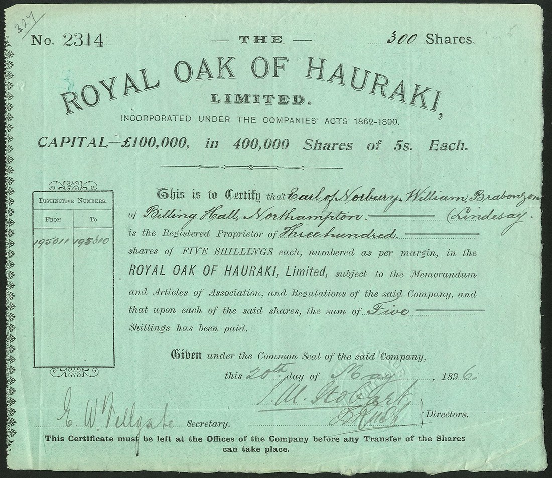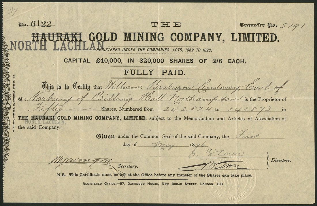 Royal Oak of Hauraki Ltd., 5 shilling shares, 189[6], black printing on green paper, together with other New Zealand Mining companies comprising North Lachlan Gold Mining Co. Ltd., over stamped from 'Hauraki', 2/6 shares, 18[96], black on buff paper, and London & New Zealand Exploration Co.Ltd., £1 shares, two examples both [1896], scrollwork to left, blue-black, all issued to the Earl of Norbury, light folds, small pin holes on all, very fine. (4)
