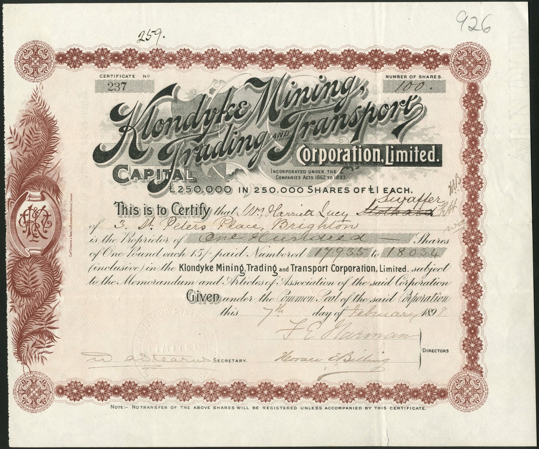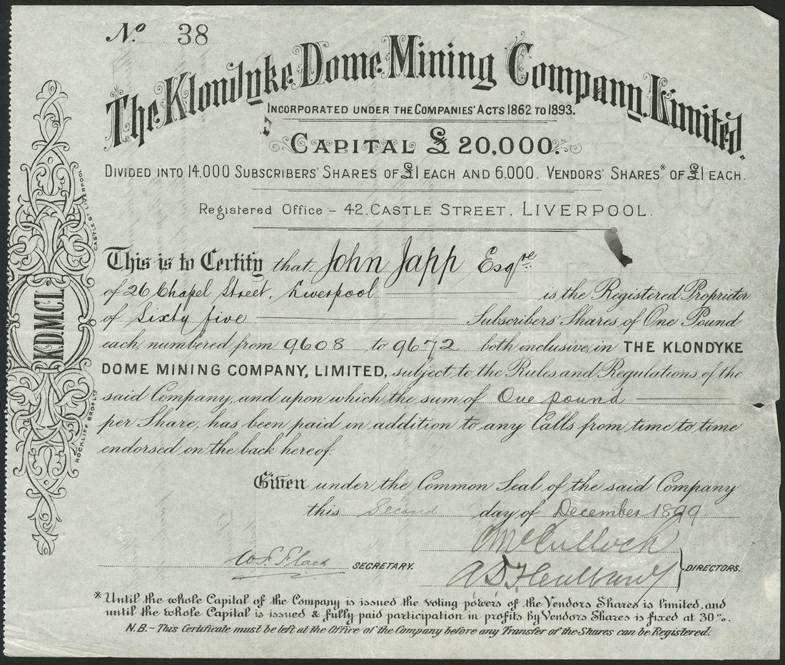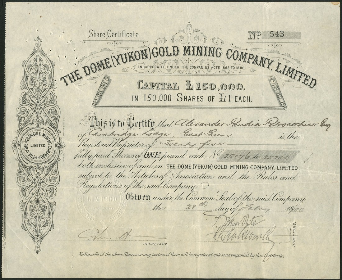 A small collection of Klondyke certificates, comprising; Quartz Creek (Yukon) Syndicate Ltd., £1 shares, 190[1], no.95, blue; Klondyke Mining, Trading and Transport Corporation Ltd., £1 shares, 189[8], no.237, brown and black; Klondyke Dome Mining Company Ltd., £1 shares, [1899], black (3); Dome (Yukon) Gold Mining Co. Ltd., £1 shares, 1[900], no.543, black, and Klondyke Government Concession Ltd., £1 priority shares, [1918], brown and pale green, the last with top left corner missing otherwise very fine. (7)