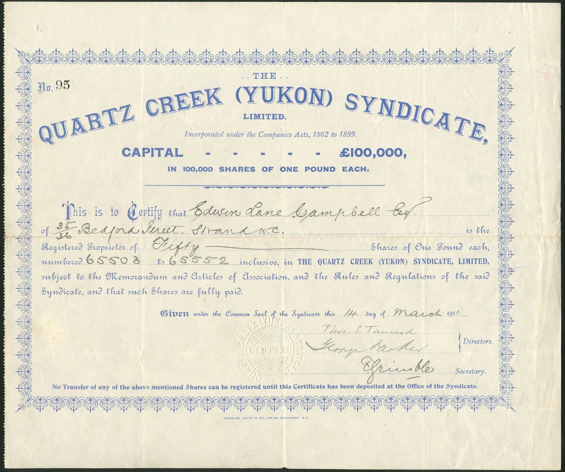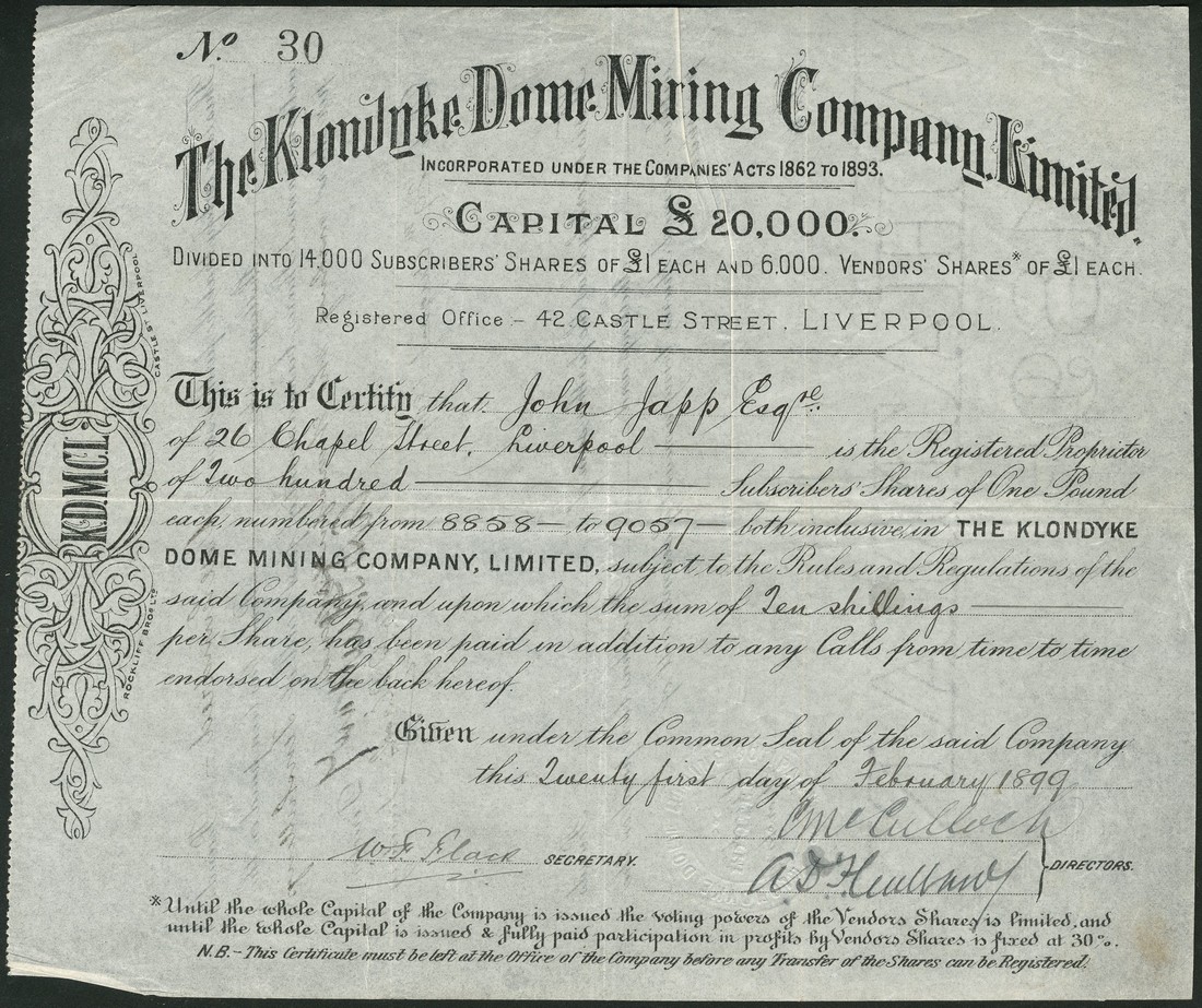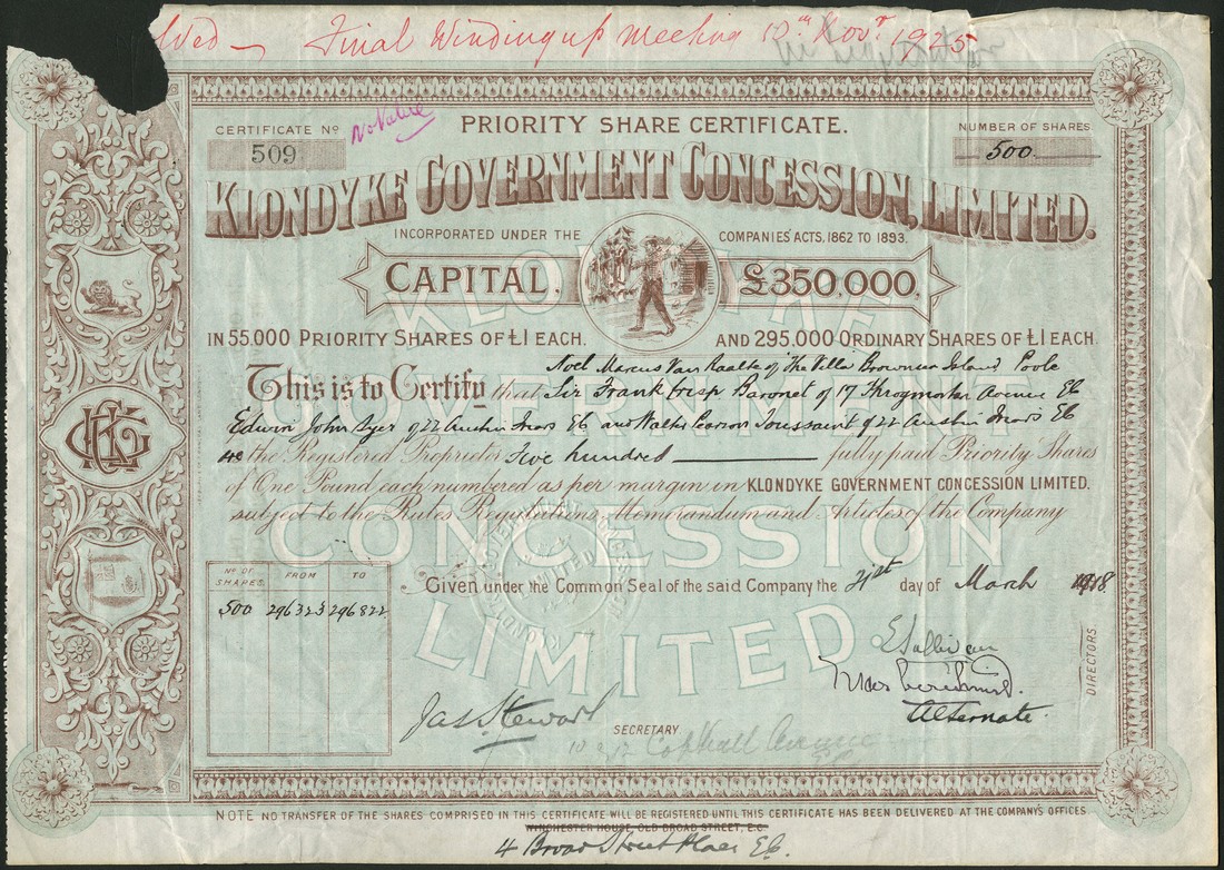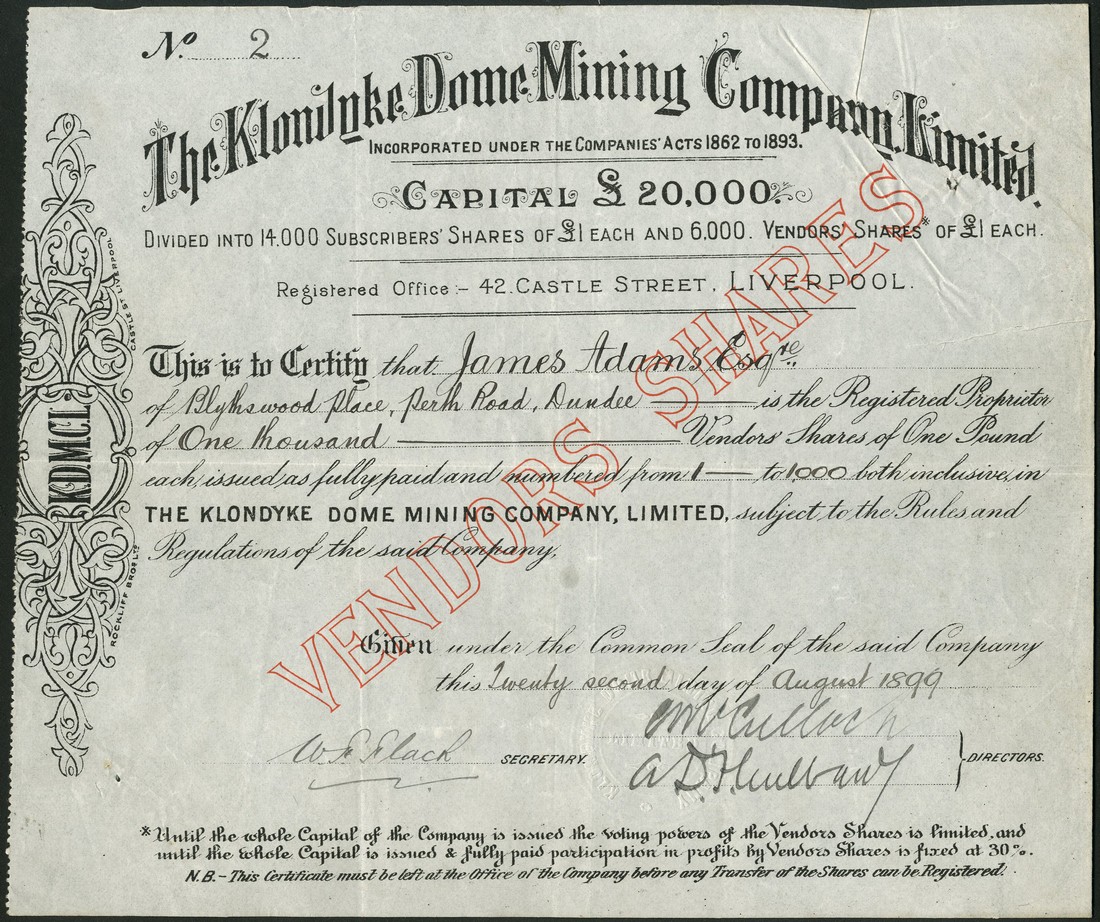 A small collection of Klondyke certificates, comprising; Quartz Creek (Yukon) Syndicate Ltd., £1 shares, 190[1], no.95, blue; Klondyke Mining, Trading and Transport Corporation Ltd., £1 shares, 189[8], no.237, brown and black; Klondyke Dome Mining Company Ltd., £1 shares, [1899], black (3); Dome (Yukon) Gold Mining Co. Ltd., £1 shares, 1[900], no.543, black, and Klondyke Government Concession Ltd., £1 priority shares, [1918], brown and pale green, the last with top left corner missing otherwise very fine. (7)