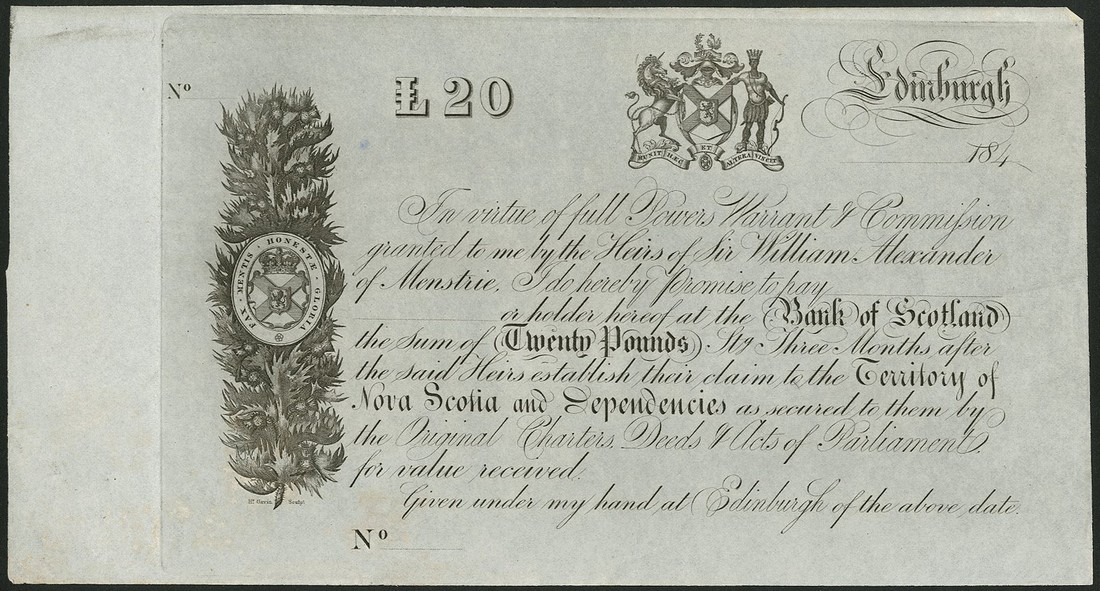 Fraudulent Claim of Hereditary Lands of Nova Scotia, un-issued bearer certificate for £20, 184[-], decorative piece with Royal Coat of Arms and Arms of the Alexander's of Menstrie, black printing, extremely fine.