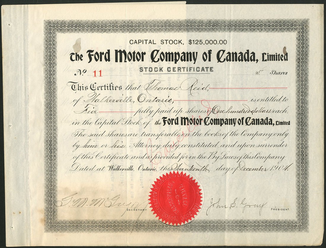 Ford Motor Company of Canada Ltd., 5 shares of Capital Stock, fully paid up, Ontario 190[4], no.11, signed by G.M. McGregor as Secretary and John D. Gray as President, ornate border, black, red embossed seal at bottom, cancelled, counterfoil reglued at left, very fine.