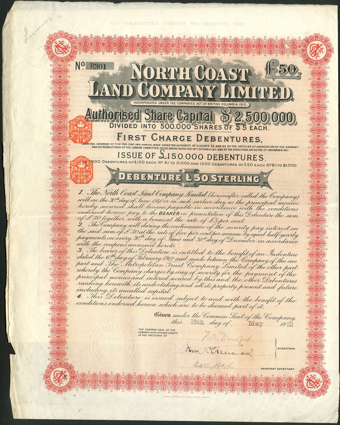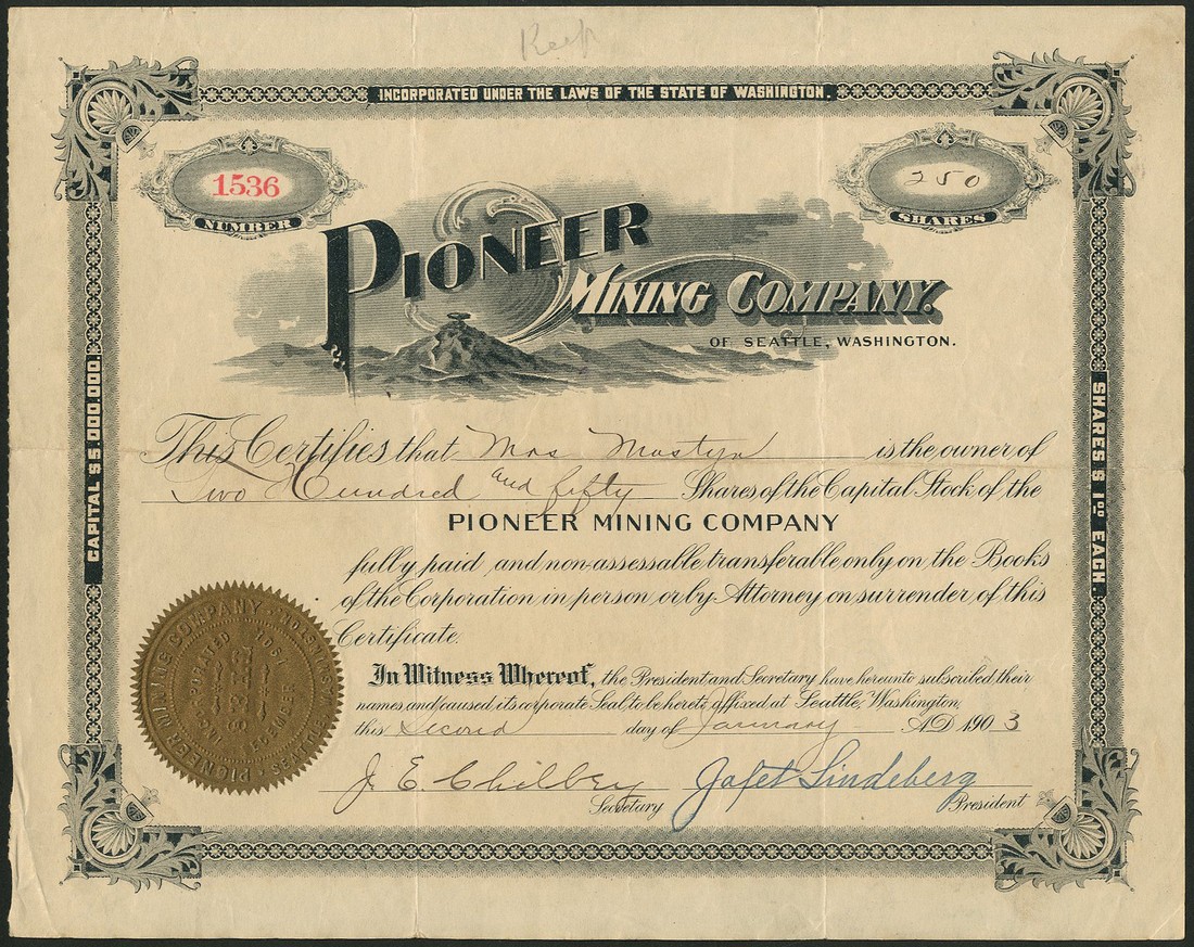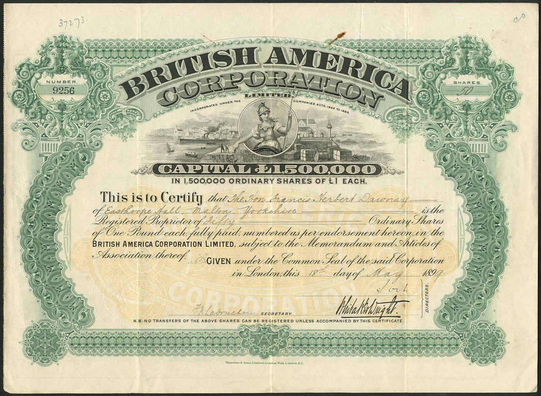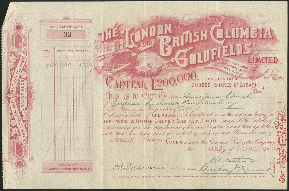 London and British Columbia Goldfields Ltd., £1 shares, 19[03], no.33, vignette of miners with hydraulic hoses and picks, red, together with other certificates from Canada and the U.S.A. (7), including British America Corporation Ltd., 1899 and London & Globe Finance Corporation Ltd., 1899, both with facsimile signature of Whitaker Wright; Montreal Cobalt Mining Co. Ltd., 1907; Pioneer Mining Company of Seattle, 1903, and others (3), fine to very fine. (8)