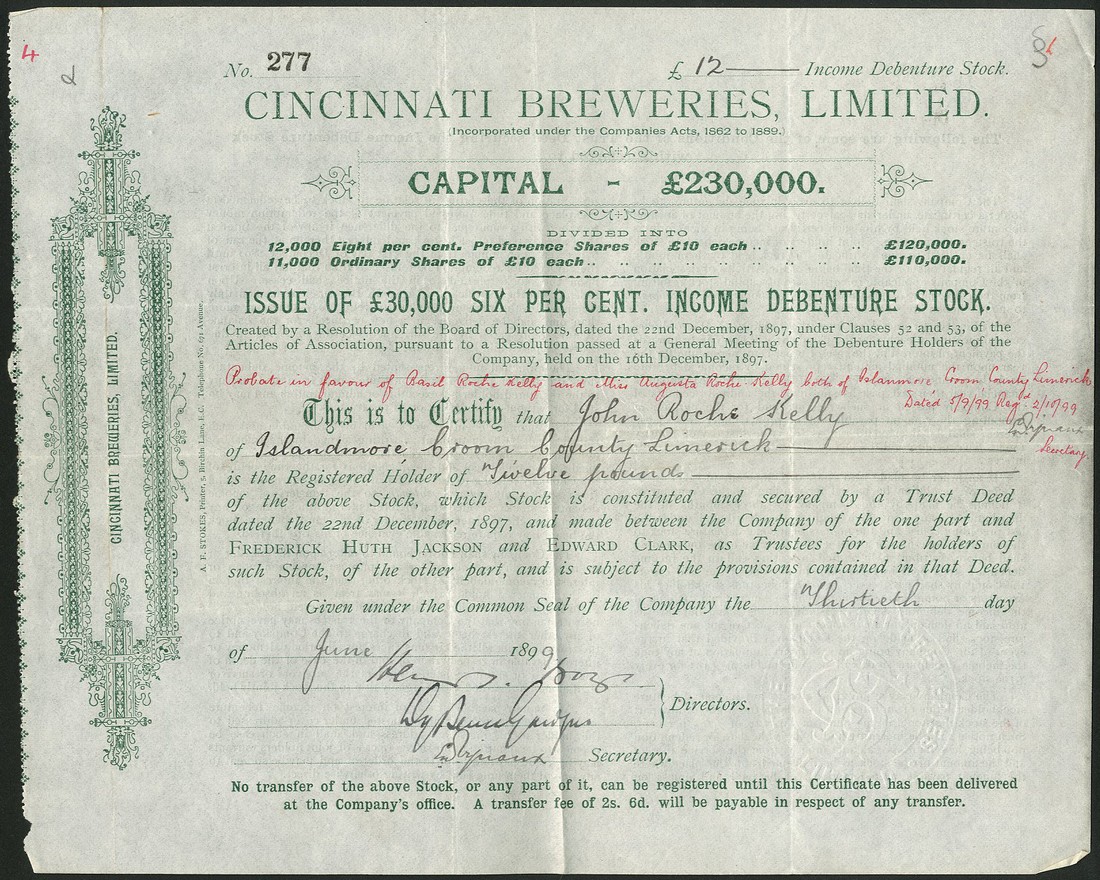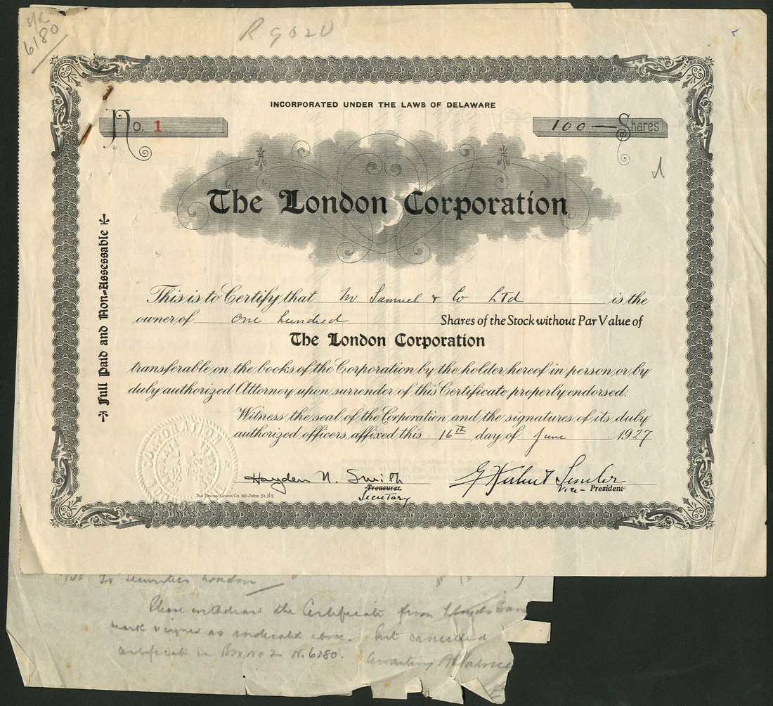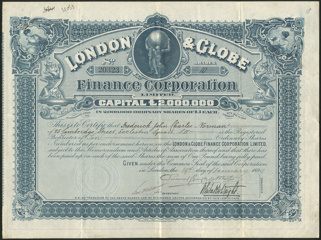London and British Columbia Goldfields Ltd., £1 shares, 19[03], no.33, vignette of miners with hydraulic hoses and picks, red, together with other certificates from Canada and the U.S.A. (7), including British America Corporation Ltd., 1899 and London & Globe Finance Corporation Ltd., 1899, both with facsimile signature of Whitaker Wright; Montreal Cobalt Mining Co. Ltd., 1907; Pioneer Mining Company of Seattle, 1903, and others (3), fine to very fine. (8)