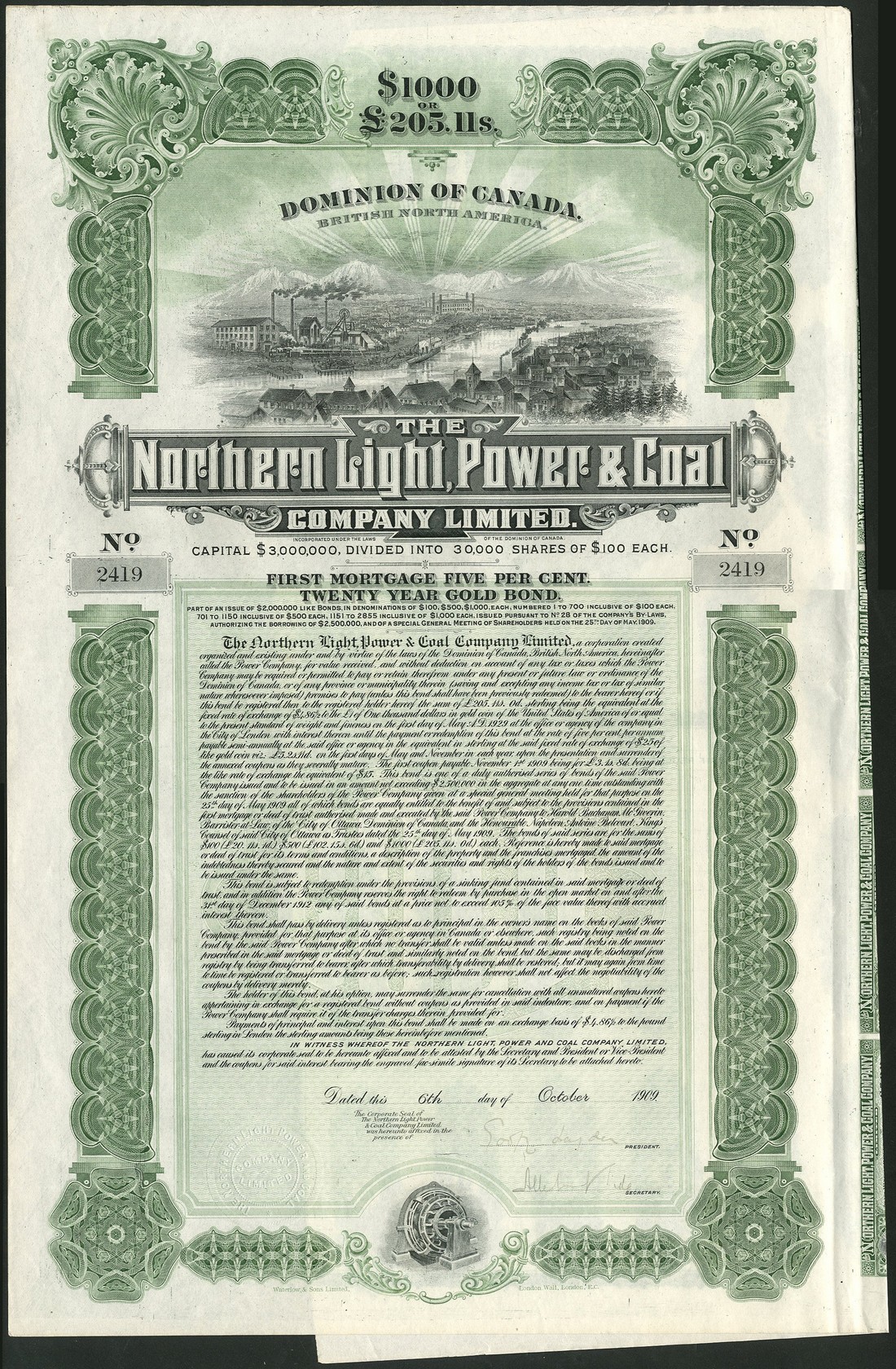 Northern Light, Power & Coal Co. Ltd., a group of 10 First Mortgage 5% 20-year Gold Bonds for $1000, 1909, large format pieces with lovely vignette of the City of Ottawa depicting river, shipping, factories and mountains in the background, green and black, with coupons, printed by Waterlow & Sons, Ltd., about extremely fine. (10)