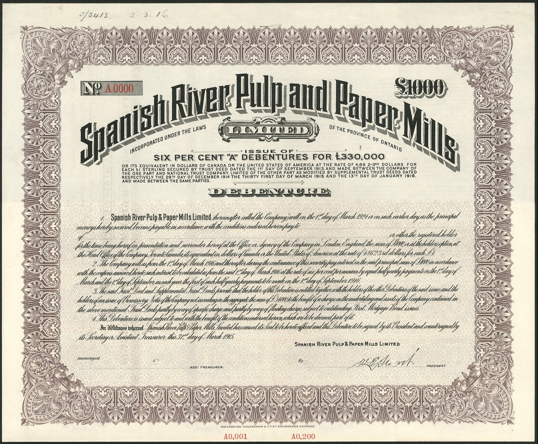 Spanish River Pulp and Paper Mills Ltd., a group of 9 specimen 6% 'A' debentures for £1000, £500, £110, £100, £22, £20, £10 and £1 (2) from the Bradbury, Wilkinson & Co. archive, ornate borders, mauve, brown, green, brown, grey, orange and blue, all with coupons, small hole cancels in signature area, generally extremely fine. (9)