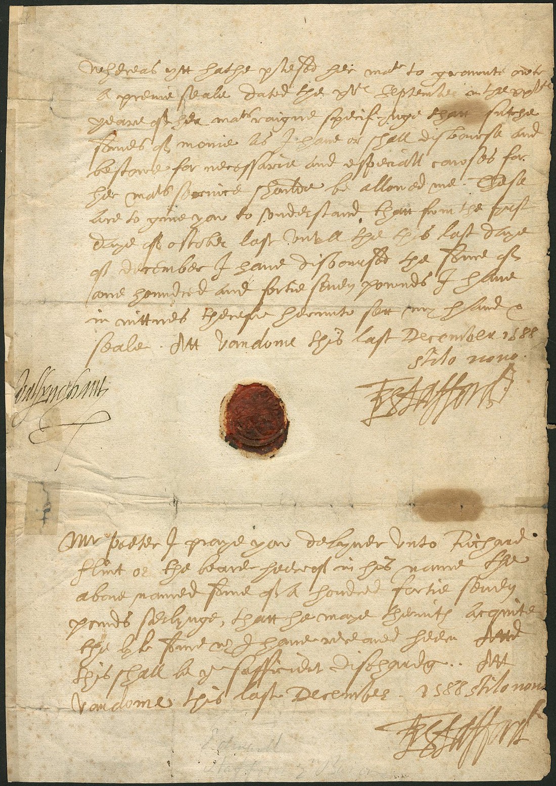 An interesting and very early manuscript payment order dated 1588, authorising the expenditure of £147 from the privy purse for “special causes” in the service of the Queen, signed by Sir Edward Stafford and Sir Francis Walsingham, some amateur repairs, fine and rare.
