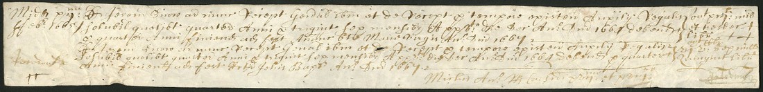 Exchequer Vellum Tally, document for two amounts of £13 and £6, 1665, made out to Jeremiah Snow, manuscript on vellum, signed by one of the four tellers of the Exchequer, very fine and scarce.