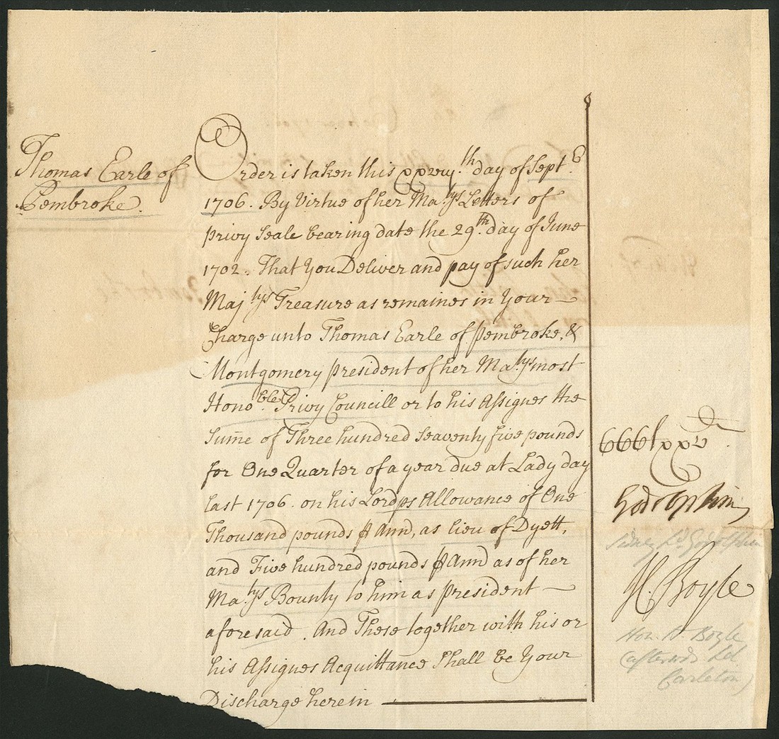 A Handwritten Order of Payment, 1706, authorising the amount of £375 to be paid to Thomas, Earl of Pembroke and Montgomery, being one quarters salary for his position as Presidnent of the Privy Council, signed by Sidney Godolphin and Henry Boyle, and on the reverse by the Earl of Pembroke and 3 witnesses, including Sir Constantine Phipps, bottom piece removed but not affecting signatures, neatly writtem up and mounted for display. (2)