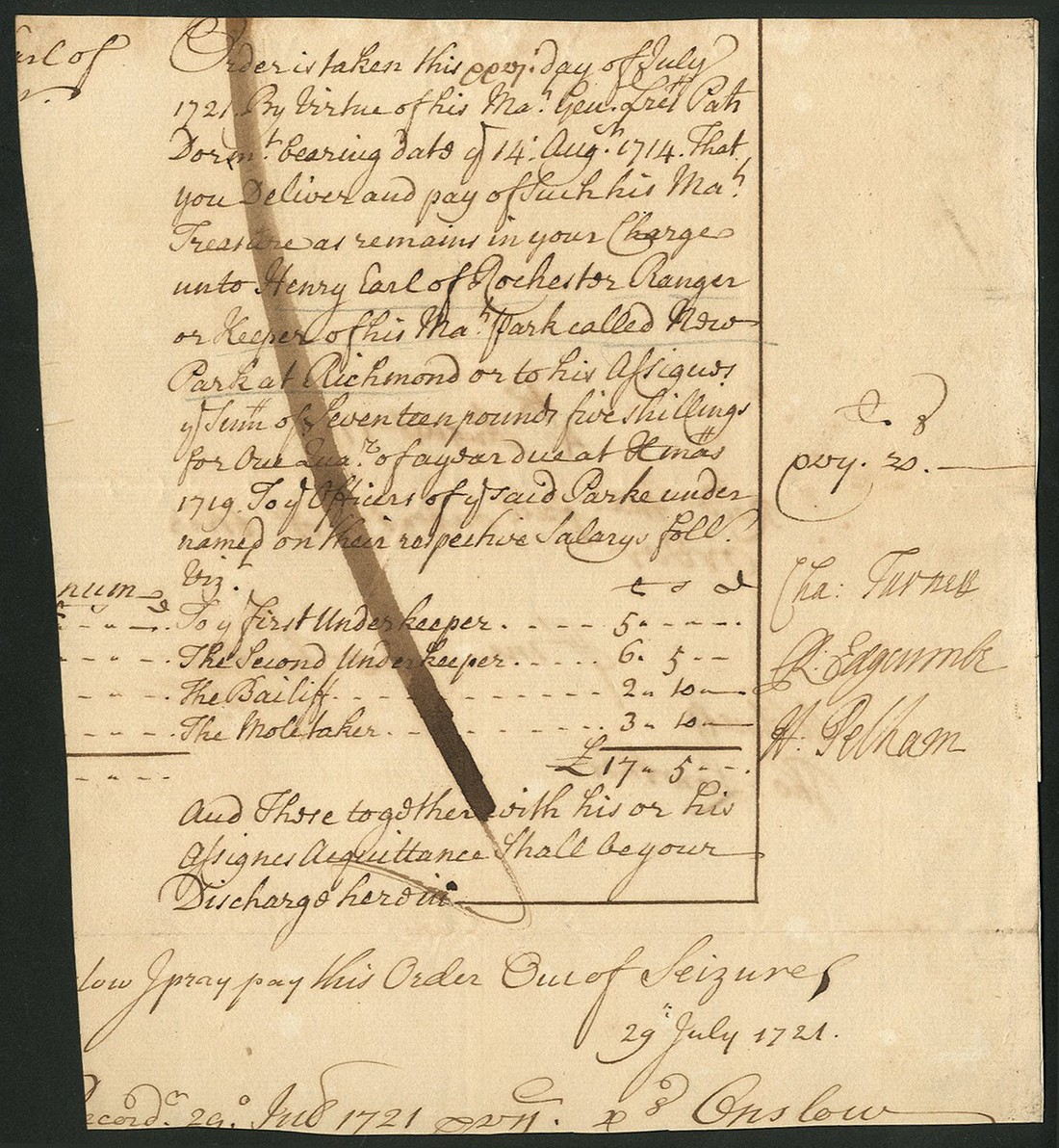 Order of Payment, 1721, instructing the Treasury to pay £17 5s to Henry, Earl of Rochester, as 'ranger or keeper of the of His Majesties Park called New Park at Richmond, to disburse to staff listed in the document, signed by Charles Turner, R. Edgecombe and Henry Pelham and examined by Lord Onslow. Signed by Rochester on the reverse, handwritten, folio, trimmed at top, bottom and left, ink cancellation, fine.