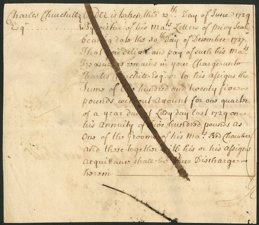 Order of Payment, 1729, authorising one quarters annual salary of £500 to Charles Churchill as 'one of the Grooms of his Ma(jesty)s Bed Chamber', signed and receipted on the reverse by Churchill, handwritten, trimmed on all sides removing all treasury officials signatures, fine.