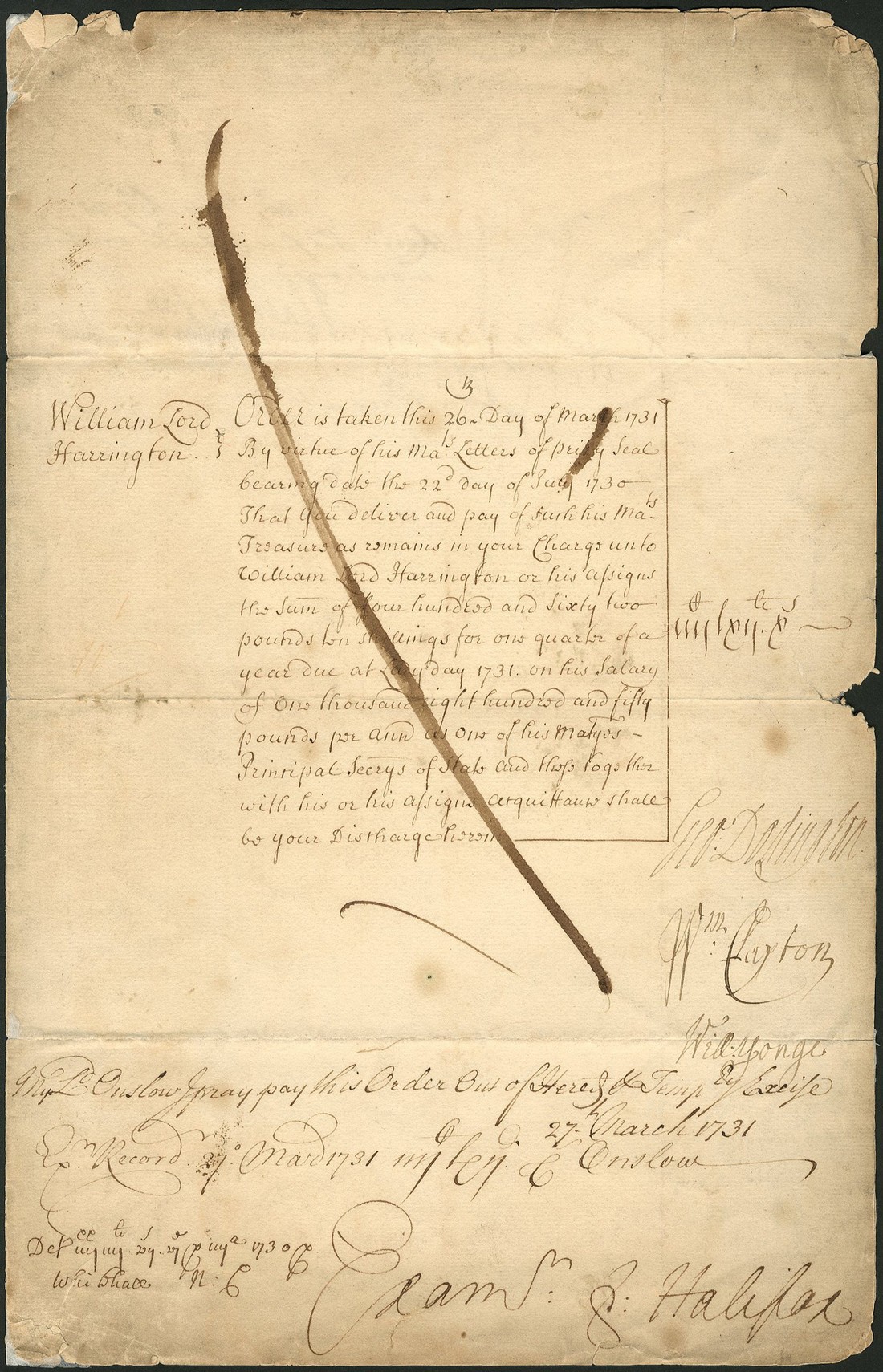 A fine Exchequer Order of Payment, 1731, manuscript document for £462.10s, made out to and signed on reverse by the Secretary of State, Lord Harrington, being 3 months of his annual salary, signed by George Dodington William Clayton and William Yonge as Commissioners of the Treasury and Lord Halifax as Auditor of the Exchequer, some discolouration and edge damage, but complete and rare thus.