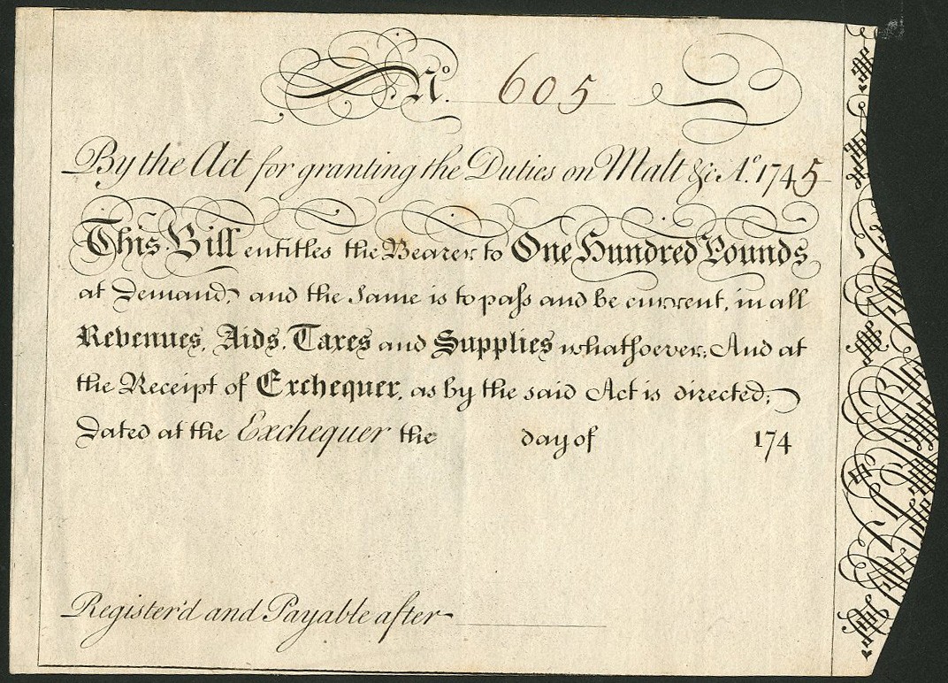 Exchequer Bill 1745, £100 bill, raised by the Act for Granting the duties on Malt etc., no.605, black on buff paper, scrollwork at right, date not completed and not registered by an Exchequer clerk, good very fine.