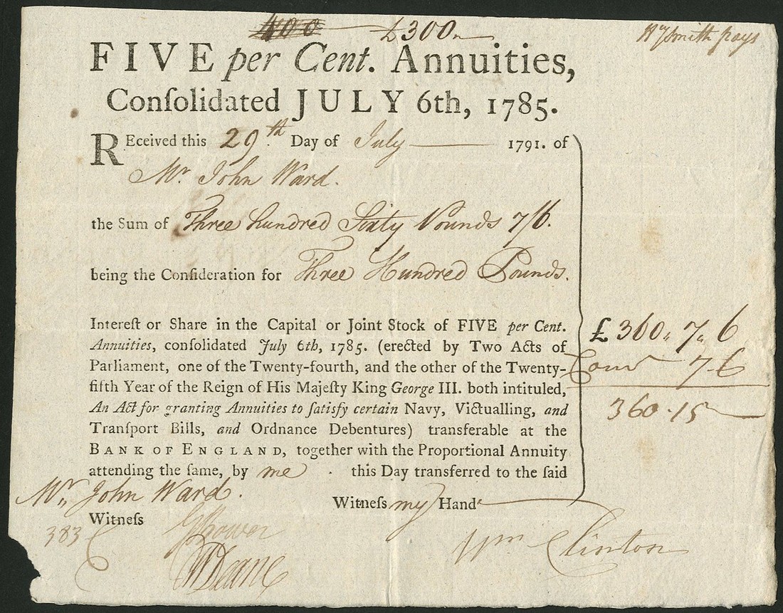 Five per Cent. Annuities, Consolidated July 6th 1785, inscribed stock receipt, dated 1791, black printing bottom right corner missing due to the usual spiking, very fine and scarce.
