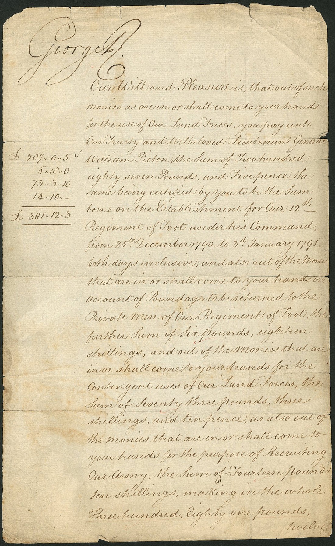 An Important Royal Warrant, 1794, instructing payment of £381.12s.3d to Lieutenant General William Picton, for costs relating to the establishment of the 12th Regiment of Foot, signed by King George III at the top, also signed by Sir George Yonge, slightly brittle but a fine signature of the King.