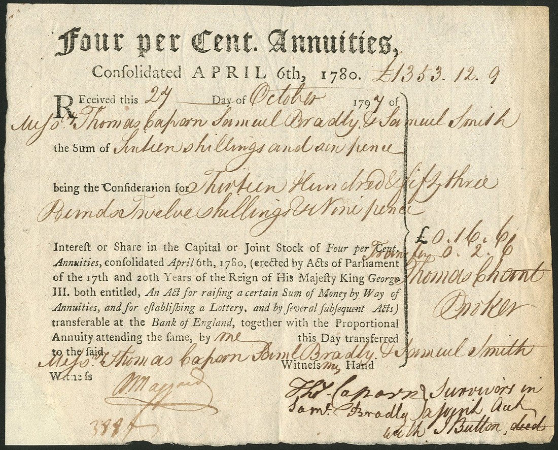 Four per Cent Annuities, Consolidated April 6th 1780, inscribed stock receipt, dated 179[7], black printing, bottom right corner missing but has been neatly repaired, very fine.