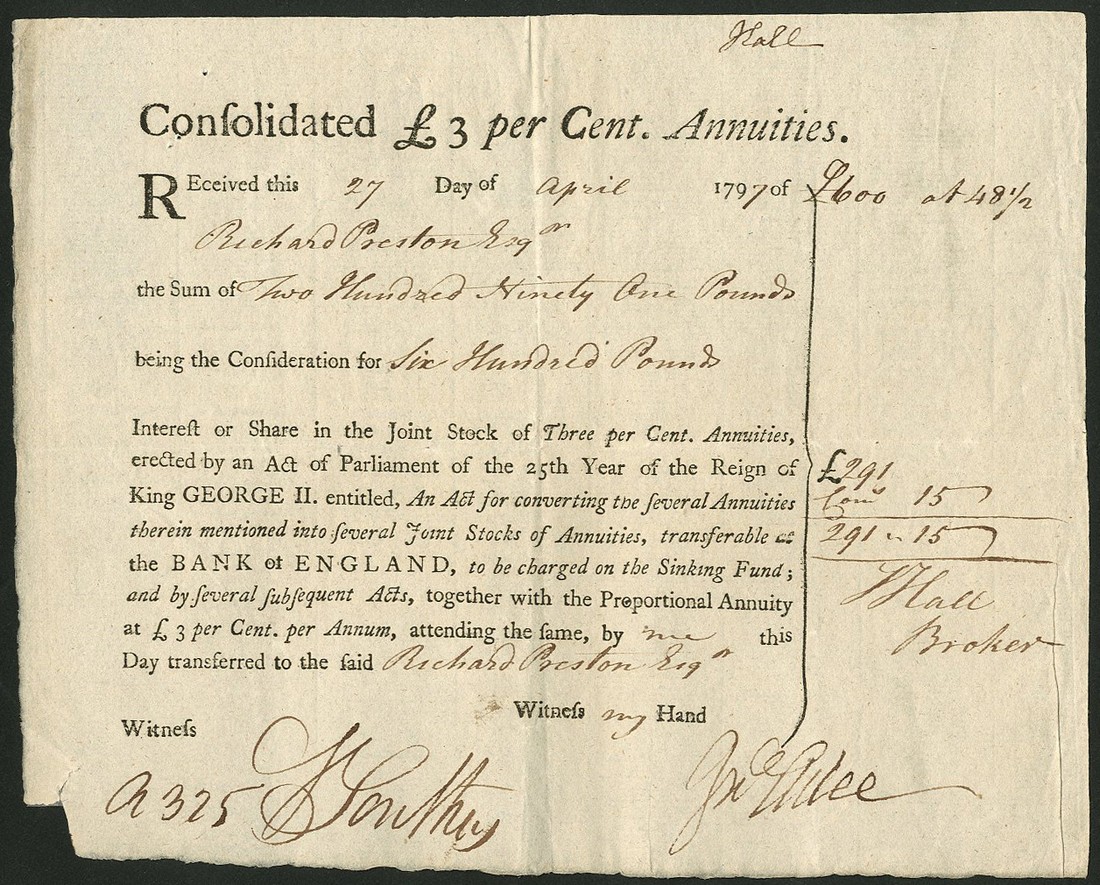 Consolidated £3 per Cent. Annuities, inscribed stock receipt dated 179[7], black printing, bottom left corner missing from spiking, very fine.