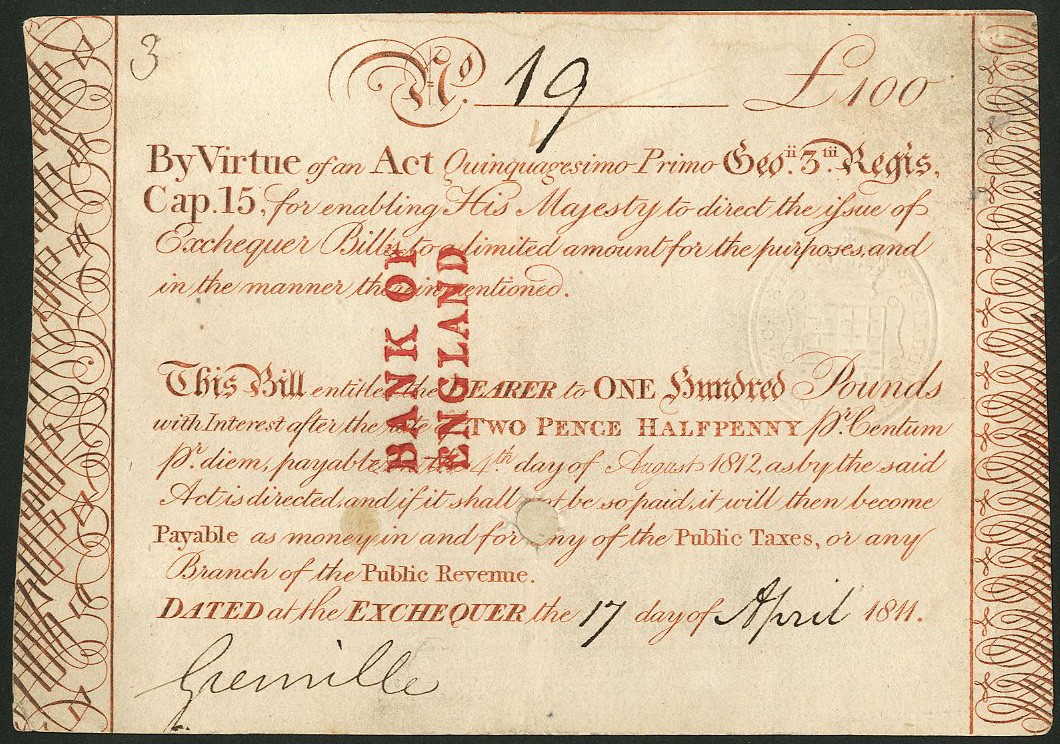 Exchequer Bill, 1811, £100, paying two pence halfpenny interest per day, no.19 signed 'Grenville' brown print, scrollwork at each side, stamped Bank of England vertically on face as payees, embossed seal to right, repaired punch hole in centre, otherwise extremely fine.