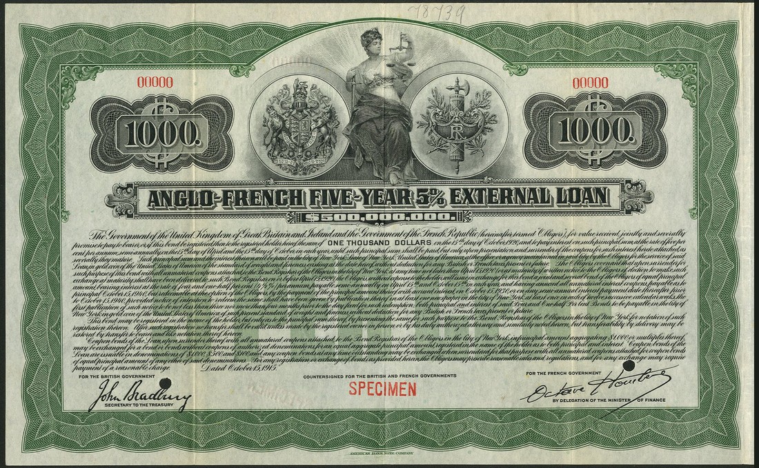 Anglo-French 5 Year 5% External Loan, 1915, a specimen bond for $1000 from the American Bank Note Co. archive, facsimile signature of John Bradbury as secretary to the Treasury, Lady Justice at top with arms either side, ornate border, green and black, small hole cancels, with coupons, good very fine.