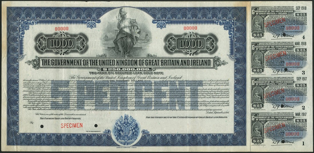 Government of the United Kingdom of Great Britain and Ireland, 2-Year 5% secured Loan, a specimen bond for $1000 dated September 1916, redeemable in September 1918, Britannia at top, coat of arms below, blue and black, printed by The American Bank Note Co., with coupons, overprinted SPECIMEN and numbered 00000 in red, light discolouration at top right, good very fine and extremely rare. No issued or cancelled bonds are known.