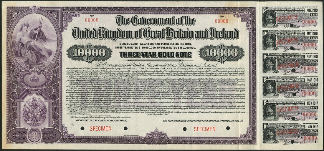 Government of the United Kingdom of Great Britain and Ireland, 3-Year 5½% Secured Loan, a specimen bond for $10,000 dated November 1916, redeemable in November 1919, Neptune at top left, coat of arms below, mauve and black, printed by the American Bank Note Co., with coupons, overprinted SPECIMEN and numbered 00000 in red, light discolouration at top right, good very fine and extremely rare. No issued or cancelled bonds are known.