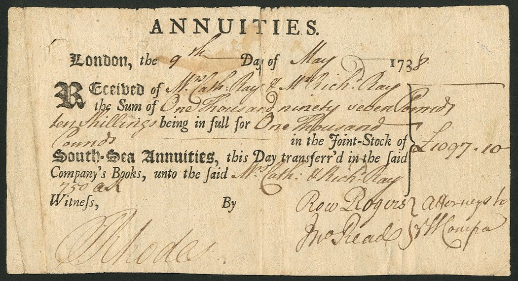 South Sea Company, Annuities, Inscribed stock certificate for transfer of £1000, 173[8], in the name of Cath. Ray and Mr Rich. Ray. small format, black printing, light stain and discolouration, fine and rare.