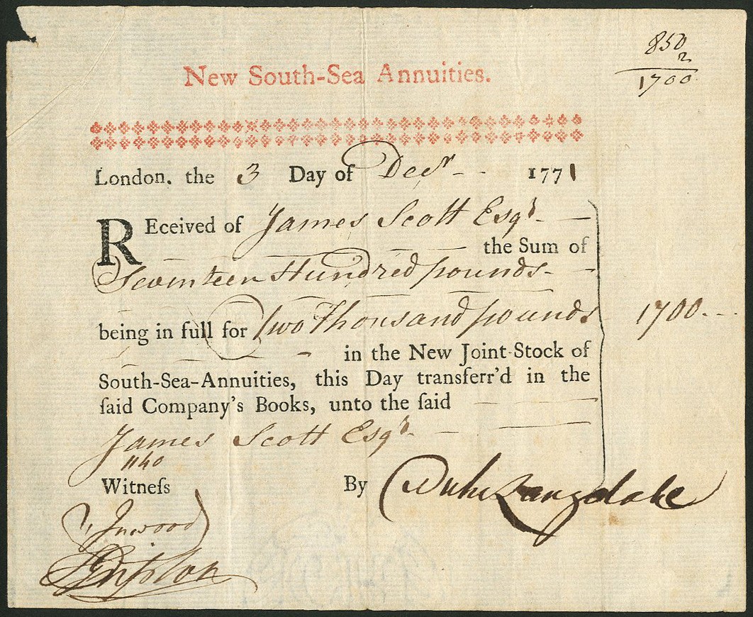 New South-Sea Annuities, inscribed stock receipt for £2000 of stock, London 177[1], heading and ornate device printed in red, remainder of text in black, small piece missing top left from spiking, otherwise good very fine.