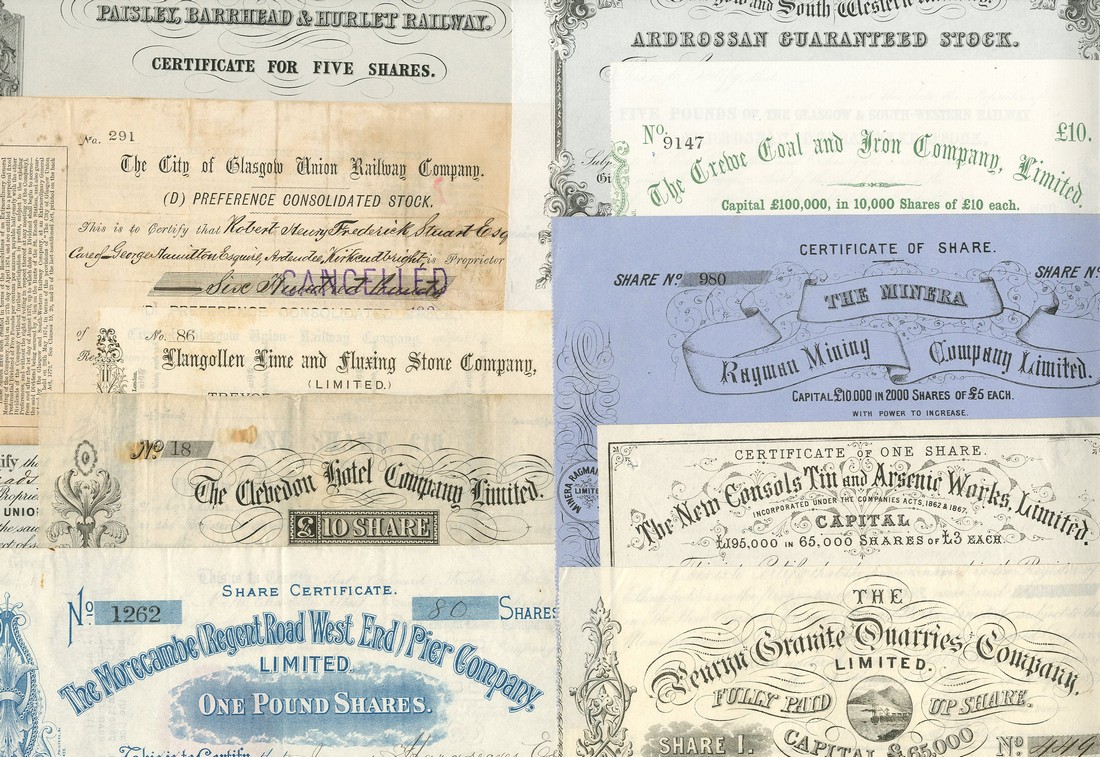 A small collection of British Certificates (33) comprising Penryn Granite Quarries Co. Ltd., 186[6], small vignette in centre; New Consols Tin & Arsenic Works Ltd., 1874; Minera Ragman Mining Co. Ltd., 18[63]; Morecambe (Regent Road West End) Pier Co. Ltd., 189[8]; Clevedon Hotel Co. Ltd., 187[6]; Llangollen Lime and Fluxing Stone Co. Ltd., 1881; Rossendale Union Foundry Co. Ltd., 186[1]; Crewe Coal and Iron Co. Ltd., 186[8], and, a set of 15 unissued certificates for Ardrossan Guaranteed Stock in the Glasgow and South Western Railway, 185-, attractive borders; other British railway certificates (10) and dividend documents (5), generally very fine to extremely fine. (38)