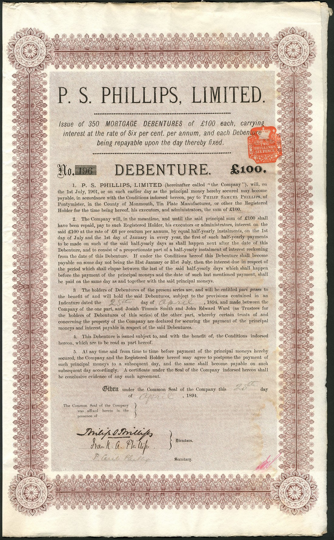 An interesting group of British debentures comprising P.S.Phillips Ltd., Tin plate manufacturers, £100 debentures, 1894 (7 examples); (New) Salisbury Club, 12 St. James' Square, £10 debentures, 1888 (8 examples); Williams's Isinglass Co. Ltd., £25, 1899 (3 examples); Atlantic Wharf Oil Storage Co. Ltd., £100 second debentures, 1894 (7 examples); London Land Association Ltd., £100 debenture, 1897 (7 examples); Army and Navy Provision Market Ltd., £50, 1881 (2 examples); Longton Hall Co. Ltd., £100, 1892 (2 examples); Crigglestone Coal Co. Ltd., near Wakefield, £100, 1904 (5 examples); Crown Collieries (1903) Ltd., £100, 1905 (4 examples); White & Pike Ltd., tinplate manufacturers, £100, 1898 (3 examples); Heins & Co. Ltd., £50, 1903; General Advertiser Ltd., A and B debentures for £100, 1897 and 1898; Irish Paper Mills Co. Ltd., £50 and £100, 1921, printed by Waterlow, and, Sandford Pottery Co. Ltd., £250, 1947 (3 examples), generally very fine and better. (56)