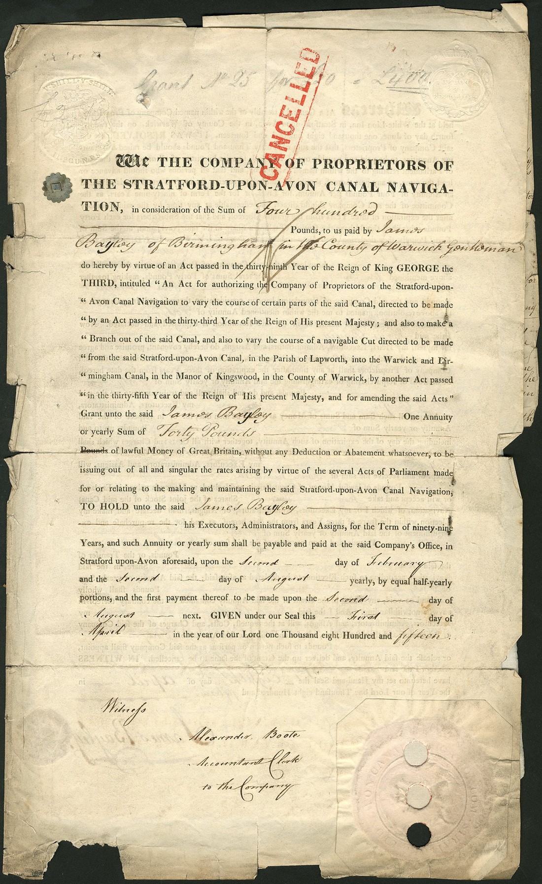 Company of Proprietors of the Stratford-upon-Avon Canal Navigation, bond for £400, paying a £40 annuity for works to 'vary the course' and 'make a branch out of the said canal', dated 18[15], black printing, stamped cancelled on face, bound together with three manuscript letters regarding transfers of the bond, dated 1818, 1825 and 1816, and grant of annuity with amendment of the amount to be paid, original date 18[15], amendment made 1874, fine but rare piece.