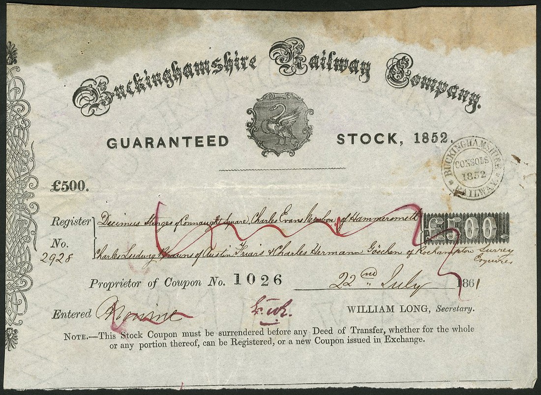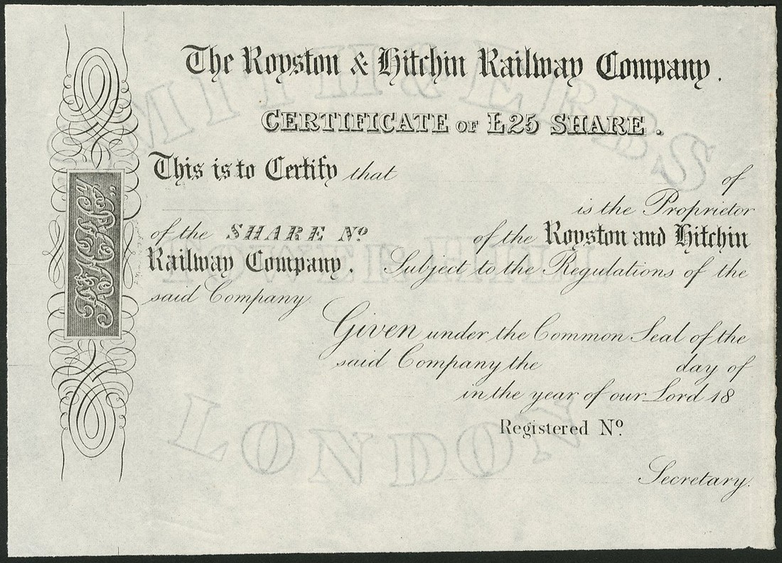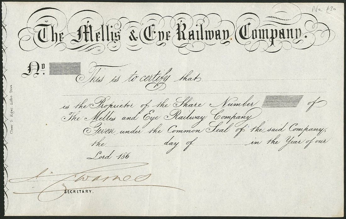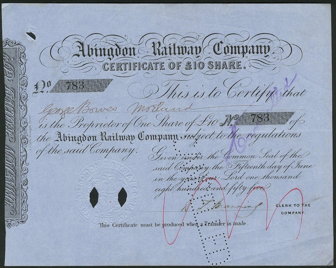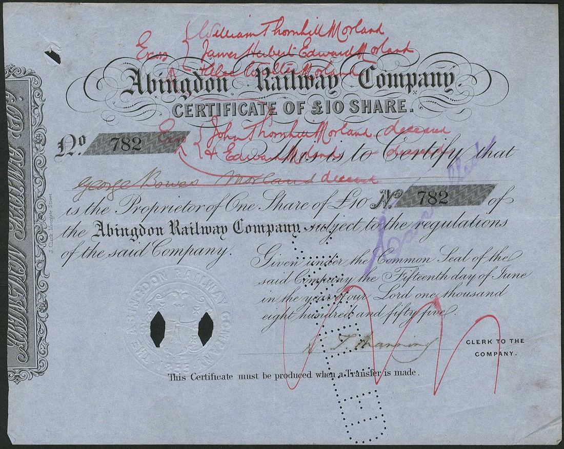 Abingdon Railway Co., two certificates for £10 shares, 1855, no.782 and 783, decorative title and scrollwork at left, black on blue paper, both cancelled, together with; Buckinghamshire Railway Co., £500 guaranteed stock, 186[1], swan in scrollwork frame at top, black; Royston & Hitchin Railway Co., un-issued £25 share, black; and Mellis & Eye Railway Co., unissued share, black, good very fine. (5)