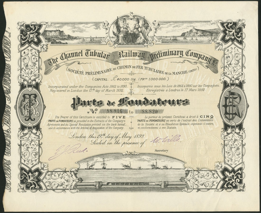 Channel Tubular Railway Preliminary Co. Ltd., a group of 4 certificates each for 5 shares, London 1892, lovely ornate border featuring the English Channel across the top, and a train in the tunnel beneath ships at the bottom, black with tan underprint, embossed company seal, good very fine or better. (4)