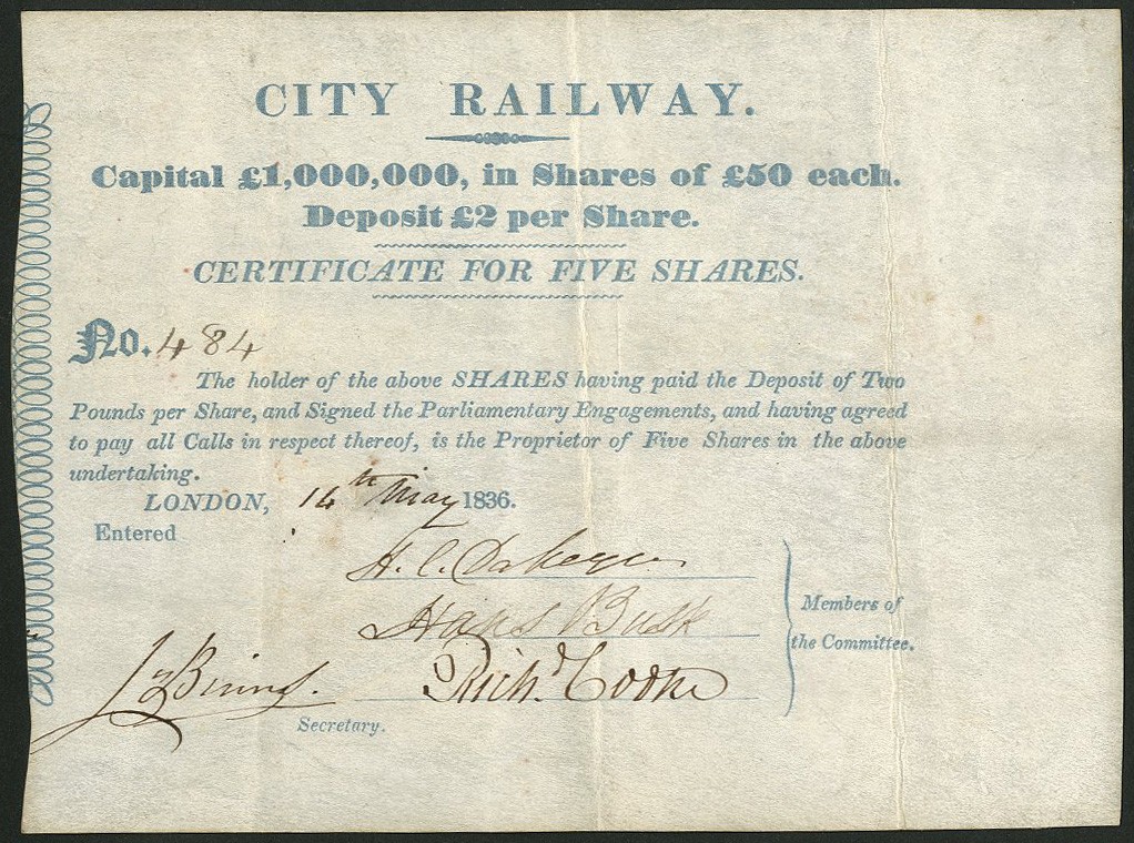 City Railway, five shares of £50, deposit paid of £2 per share, London 1836, no.484, blue print on vellum, very fine and scarce.