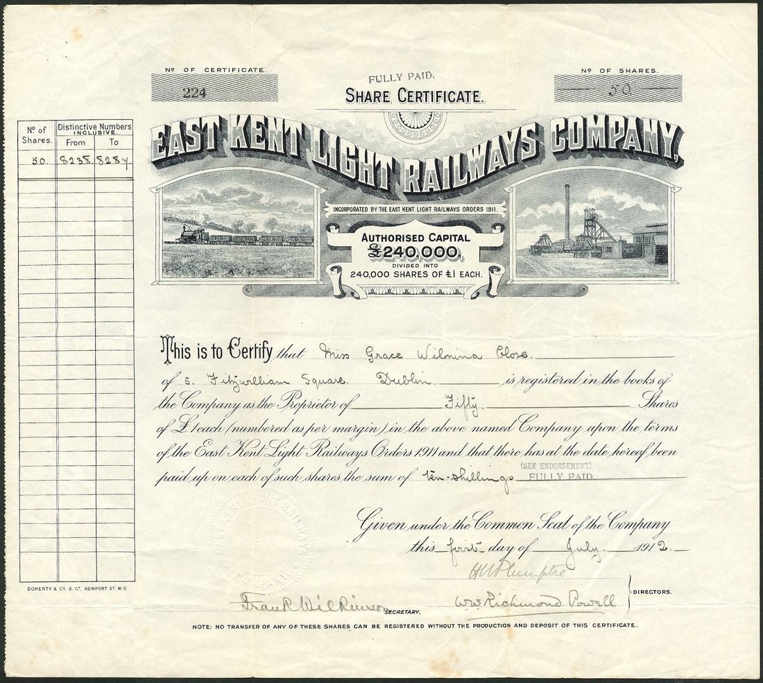 East Kent Light Railways Company, £1 shares, part paid, stamped fully paid, 191[2], Capital £240,000, no.224, vignettes of steam train and colliery buildings, dark blue, very fine.